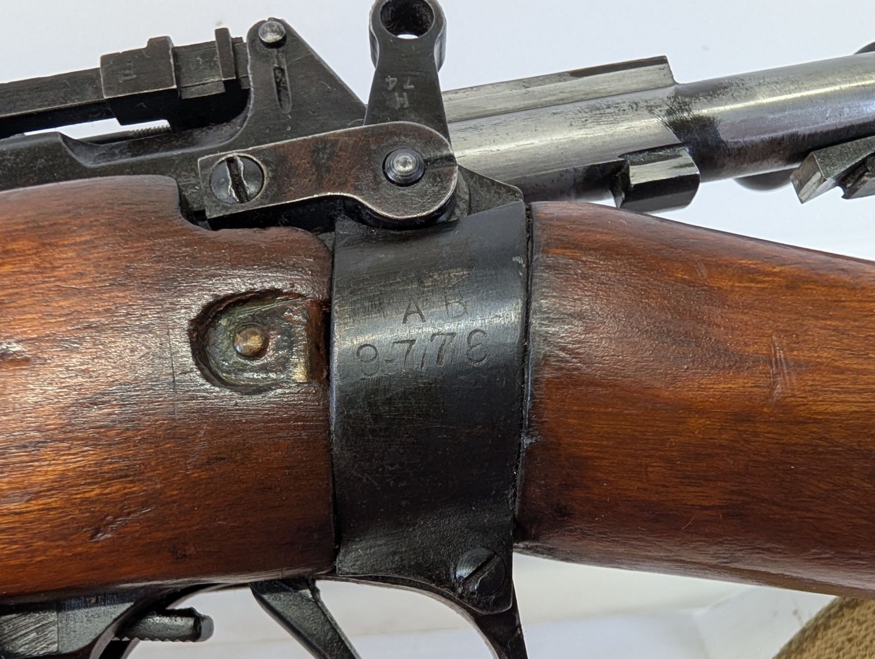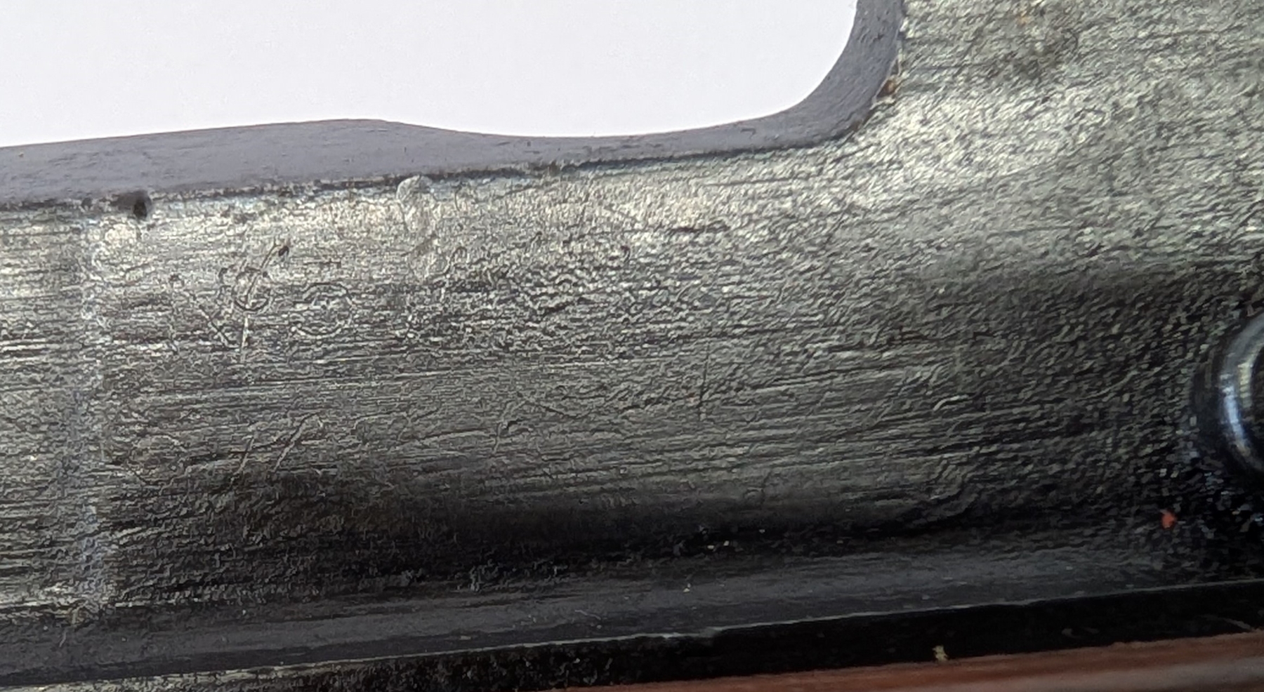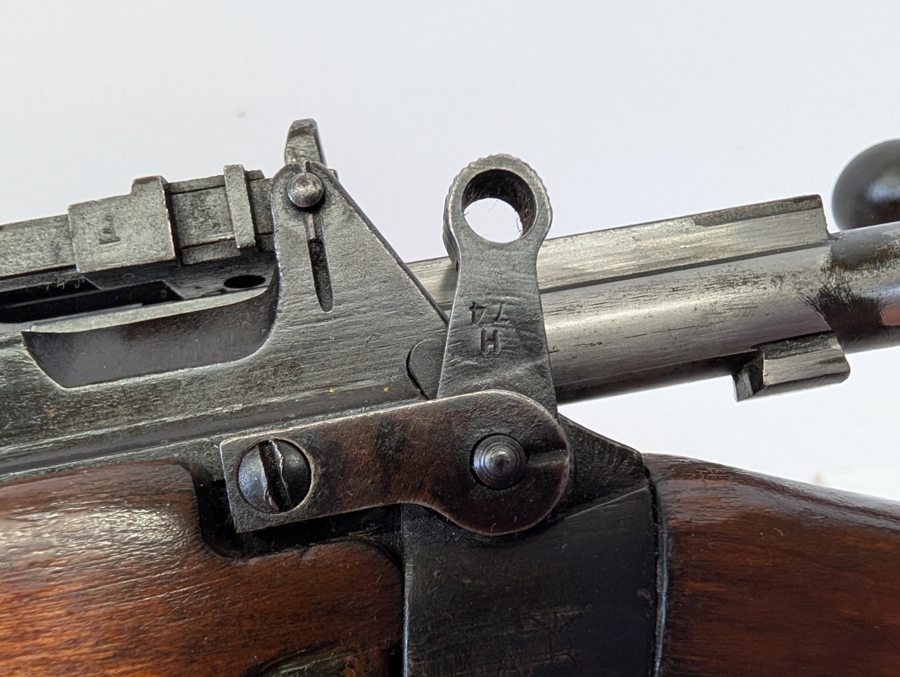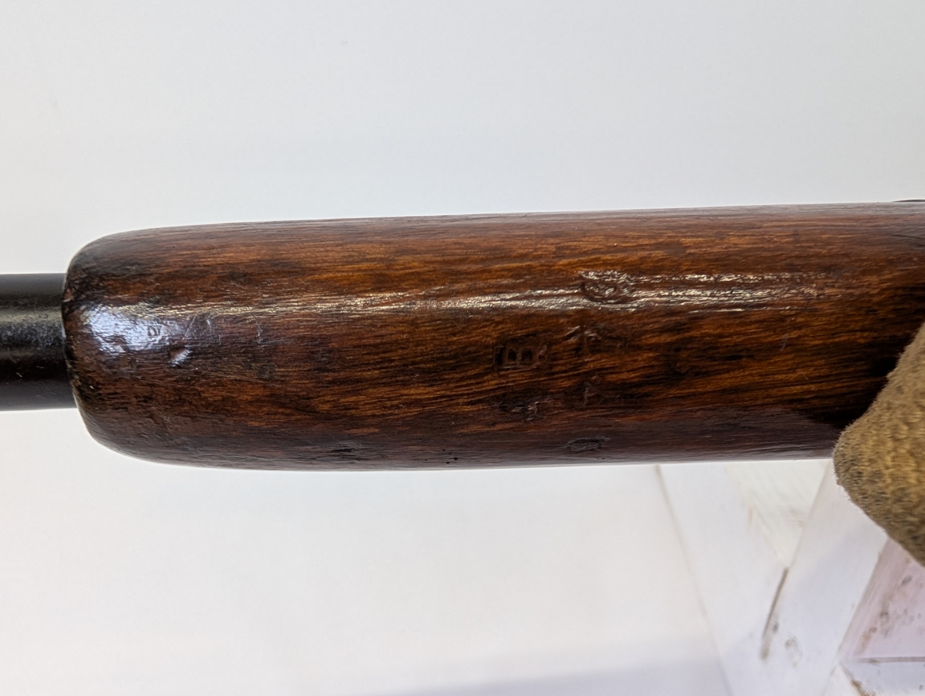 Metal shows some finish wear, serial numbers match on the bolt and receiver grip ring, there is a scuffs and some light scratches and light pits on the bolt handle. There are no other markings on the rifle except a '*' on the barrel ring and a letter 'B' on the rear sight. Condition is good for age.