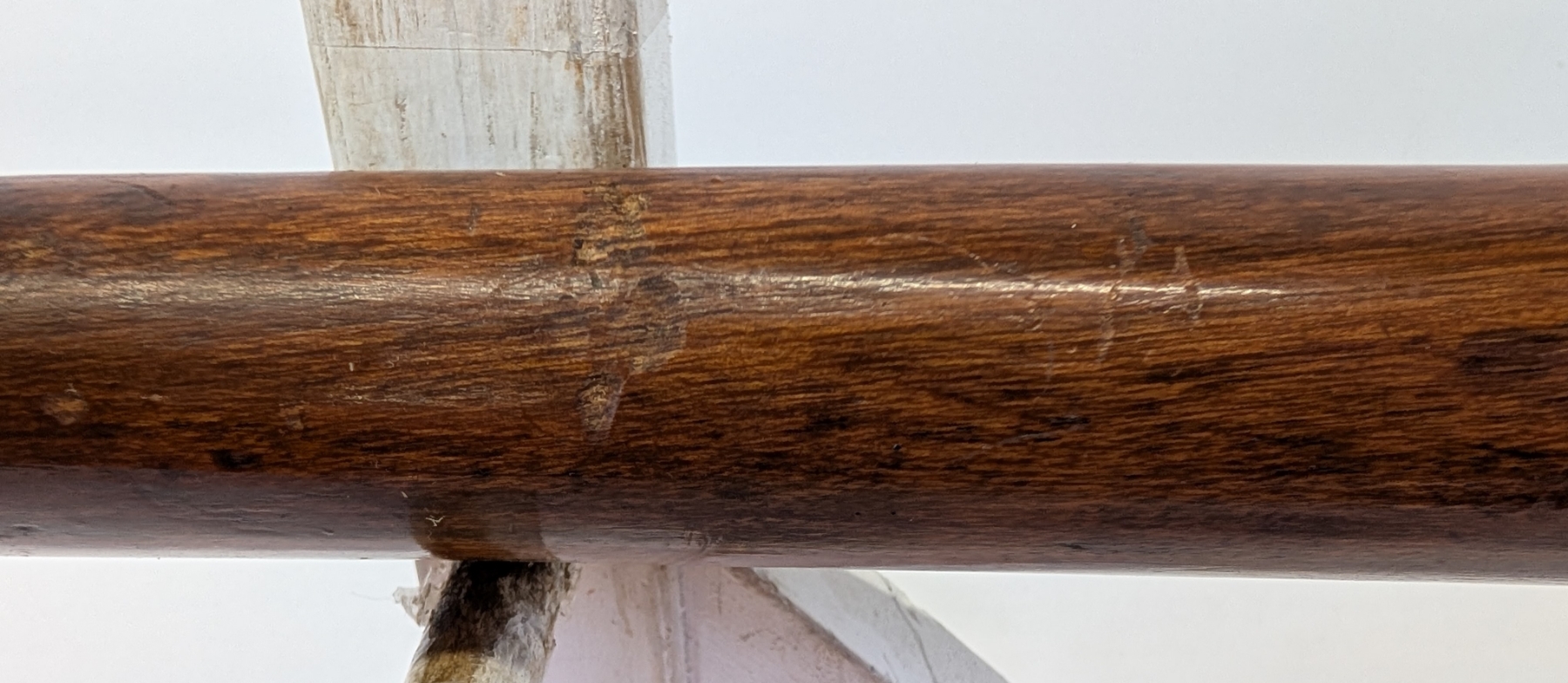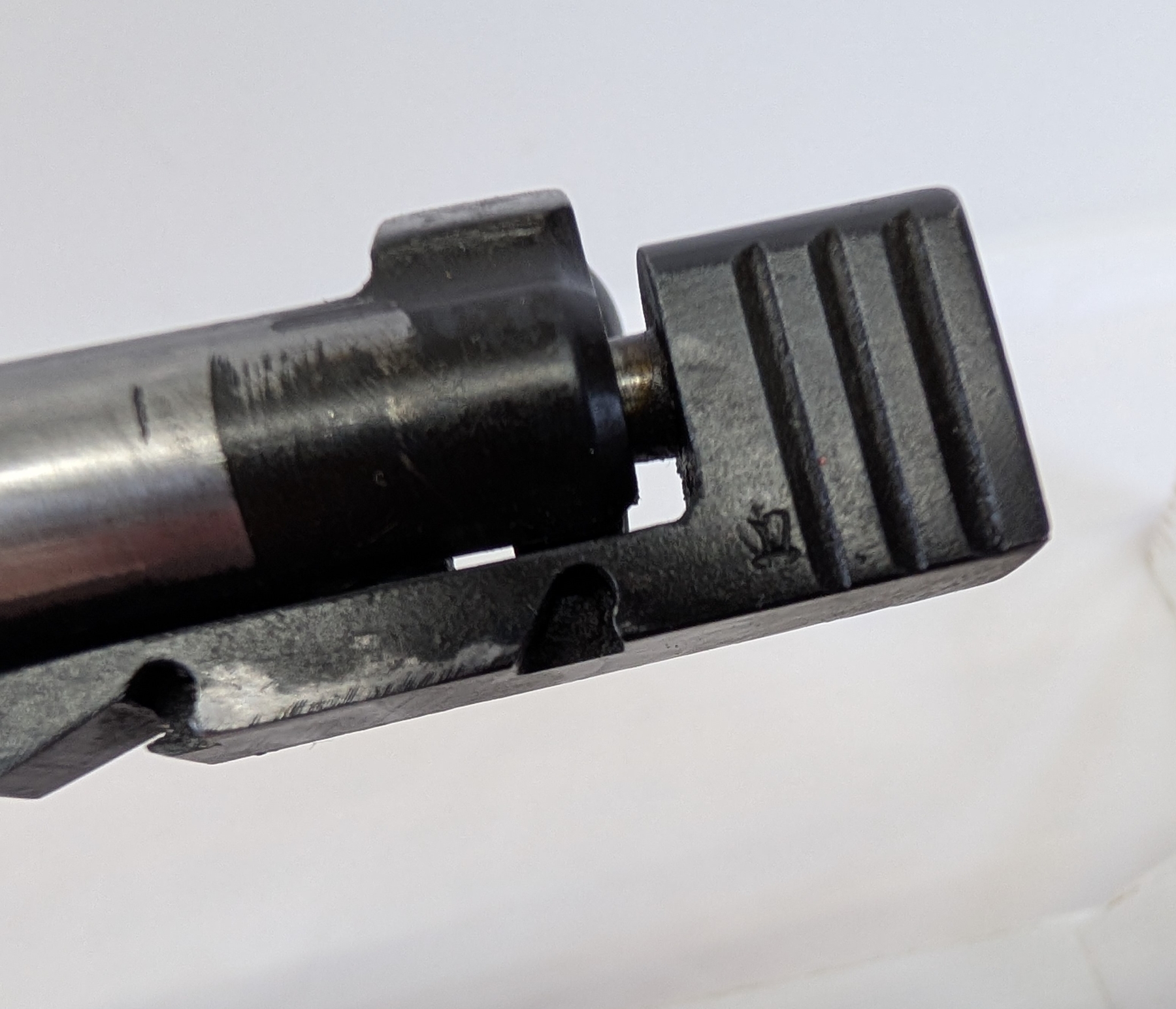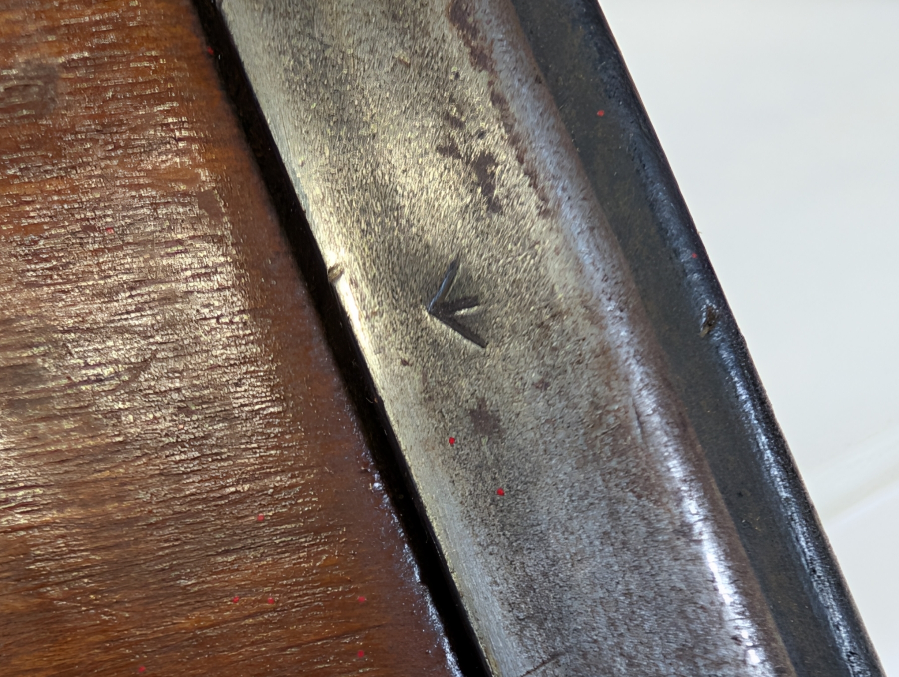 Metal shows some finish wear, serial numbers match on the bolt and receiver grip ring, there is a scuffs and some light scratches and light pits on the bolt handle. There are no other markings on the rifle except a '*' on the barrel ring and a letter 'B' on the rear sight. Condition is good for age.