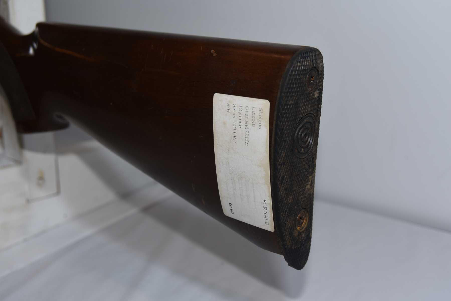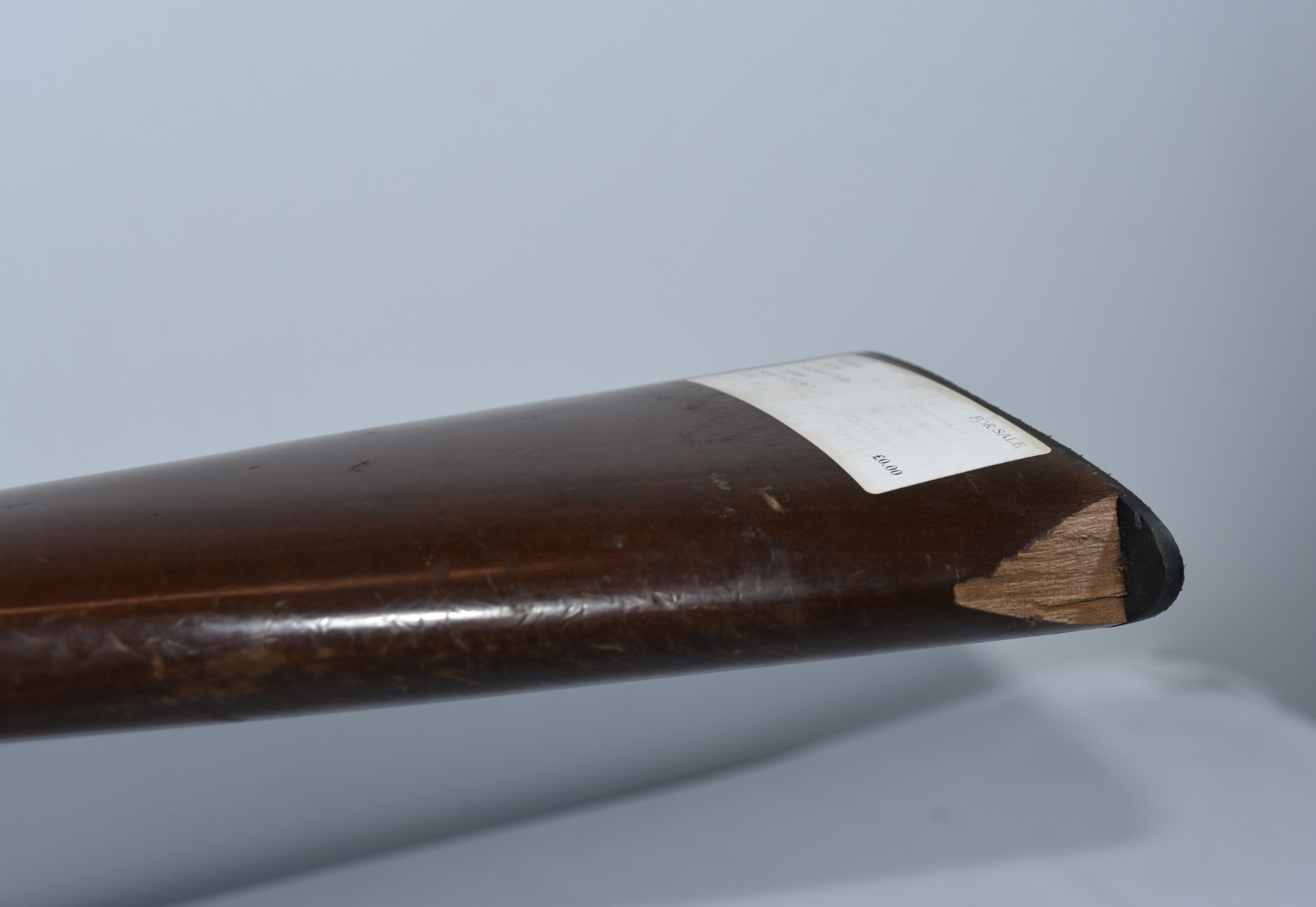 Wood stock shows a piece missing at the heel of the stock, finish wear areas, scratches, scuffs, light dents; condition is fair.