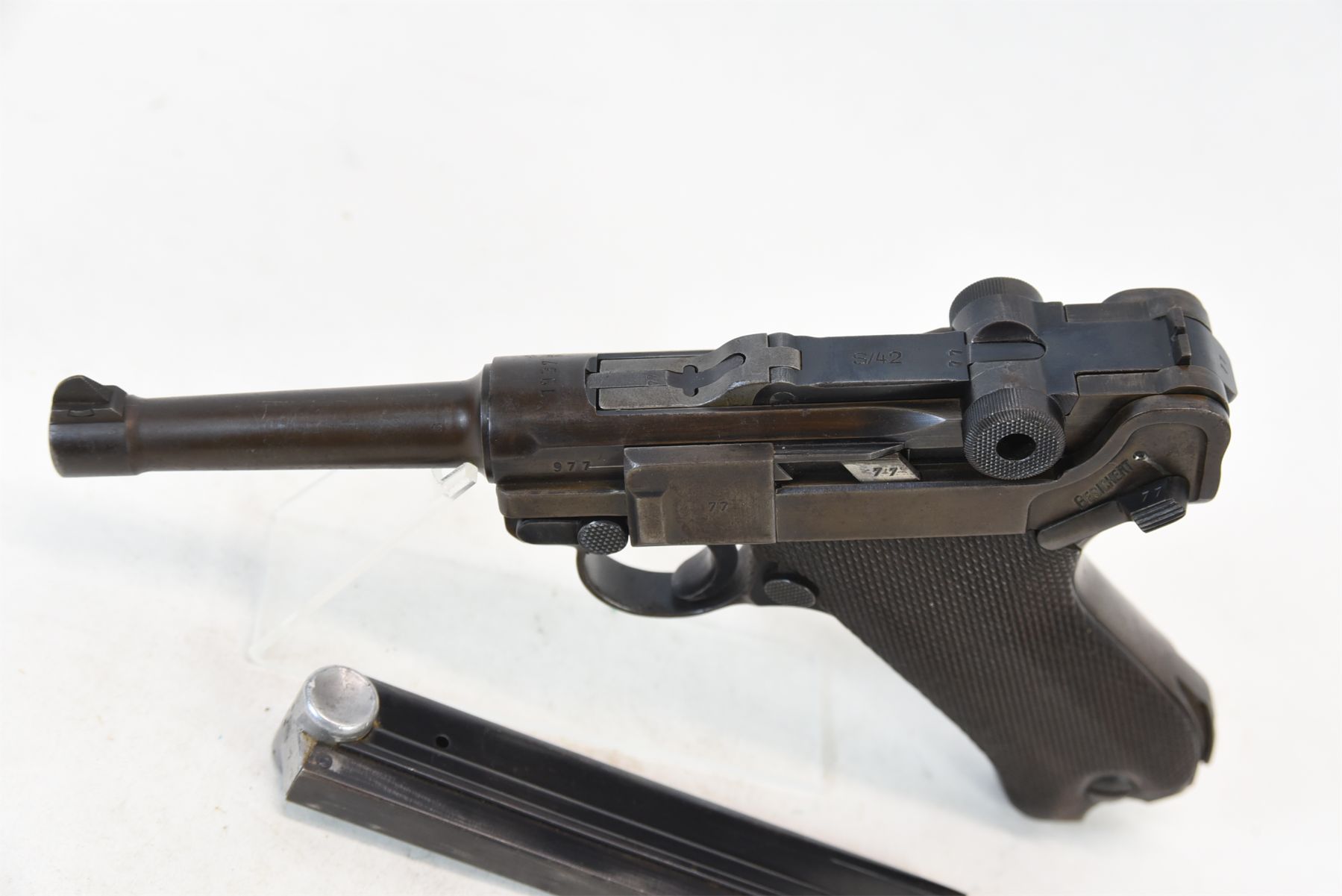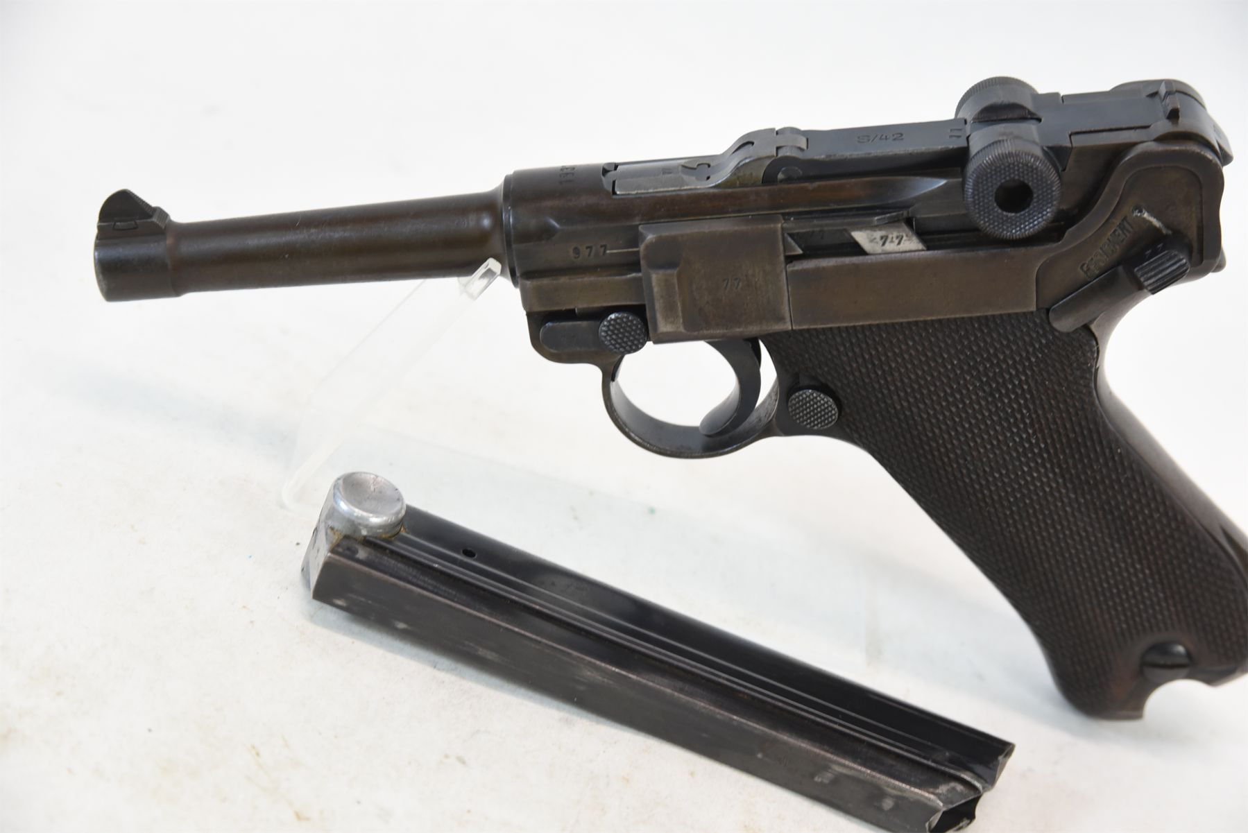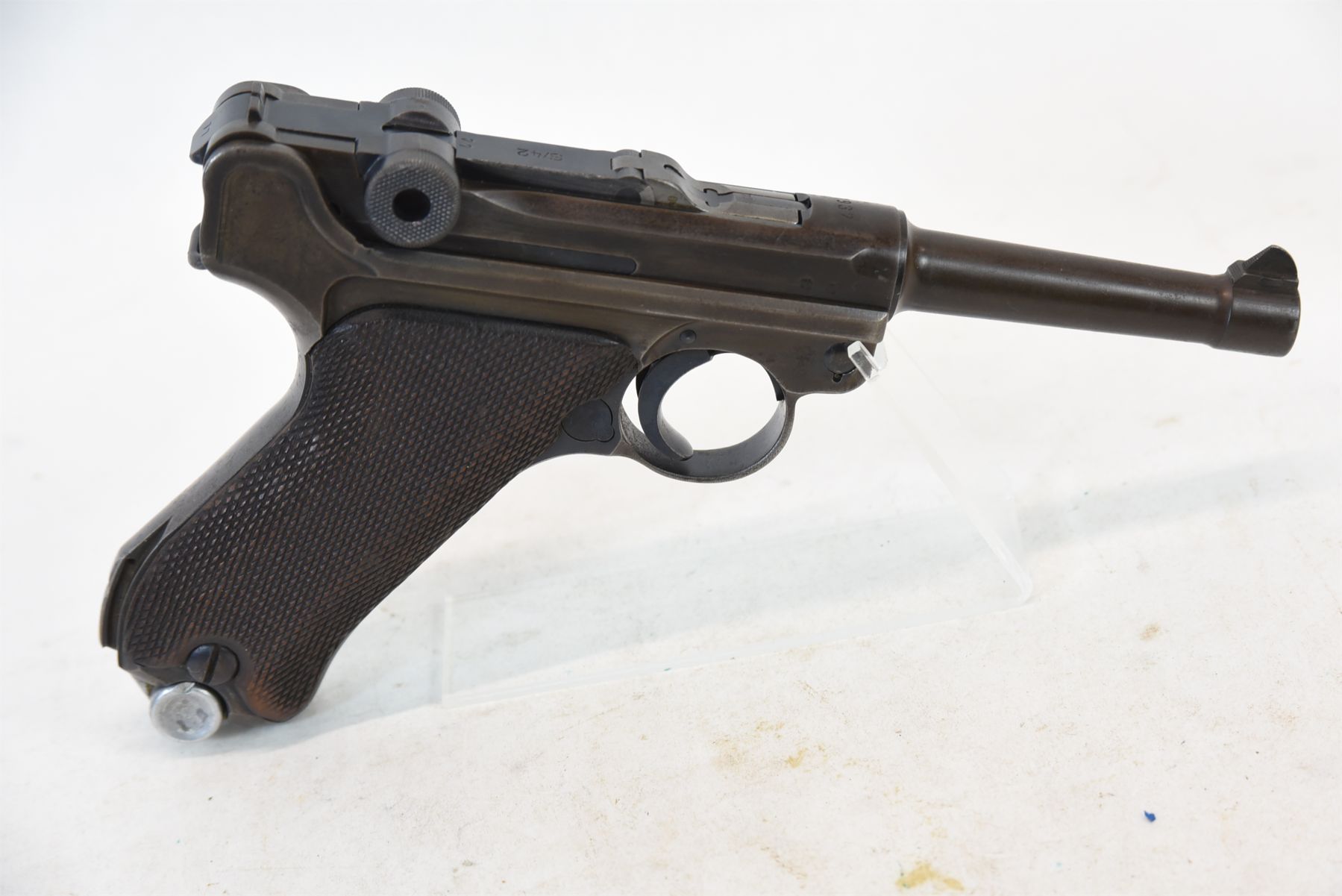 The grips are showing a little wear. The bluing is brown. The bore is very good. Magazine number does not match the gun.