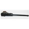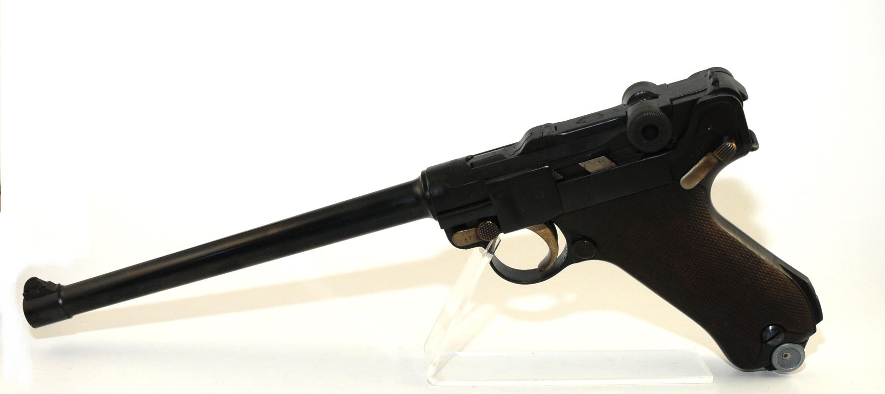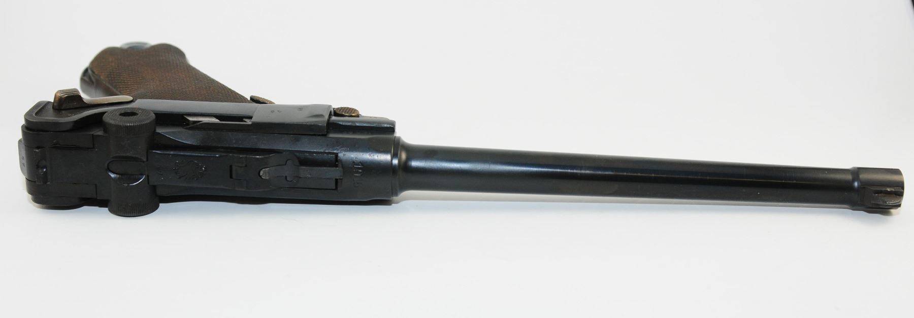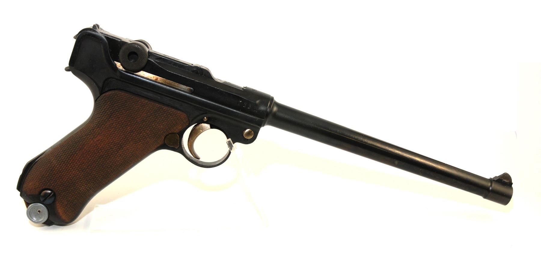 Restricted, semi auto, 9mm Luger, new 200mm barrel, SN 9867F. Wood grips very good, reblued condition, bore excellent. Mismatched serial number on side plate and mag, all other serial numbers match.