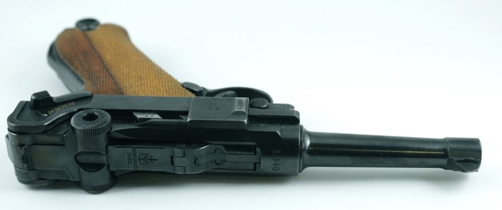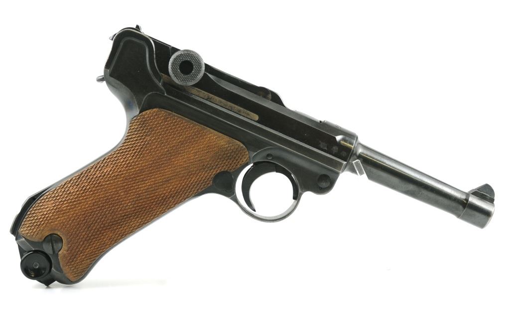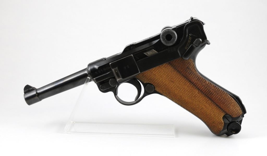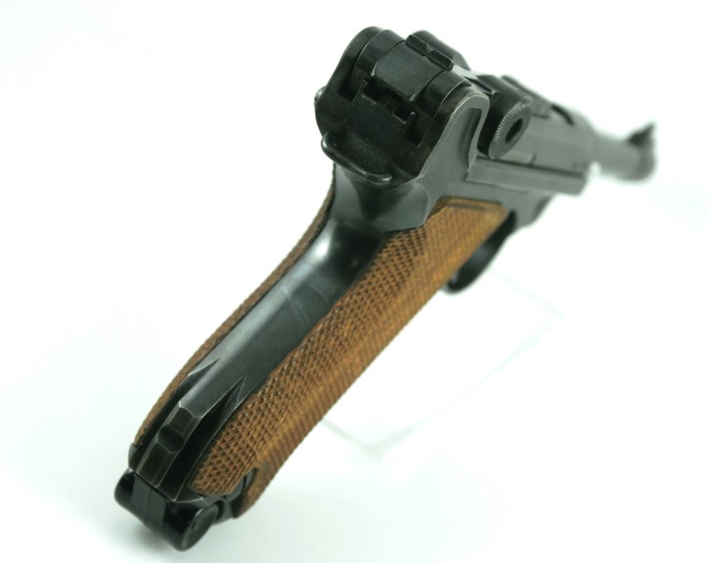 Prohibited, semi auto, 9mm Luger, 102mm barrel, SN 10125B. Wood grips very good, bluing worn on high points, bore pitted.