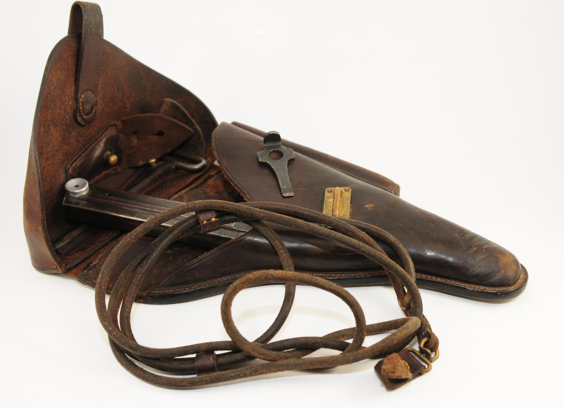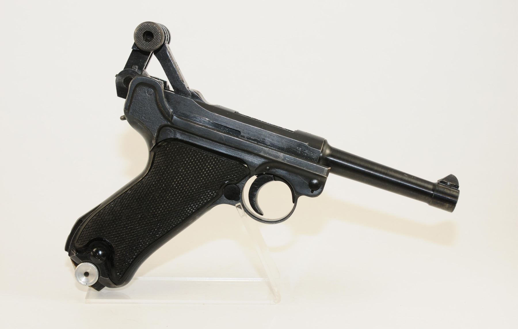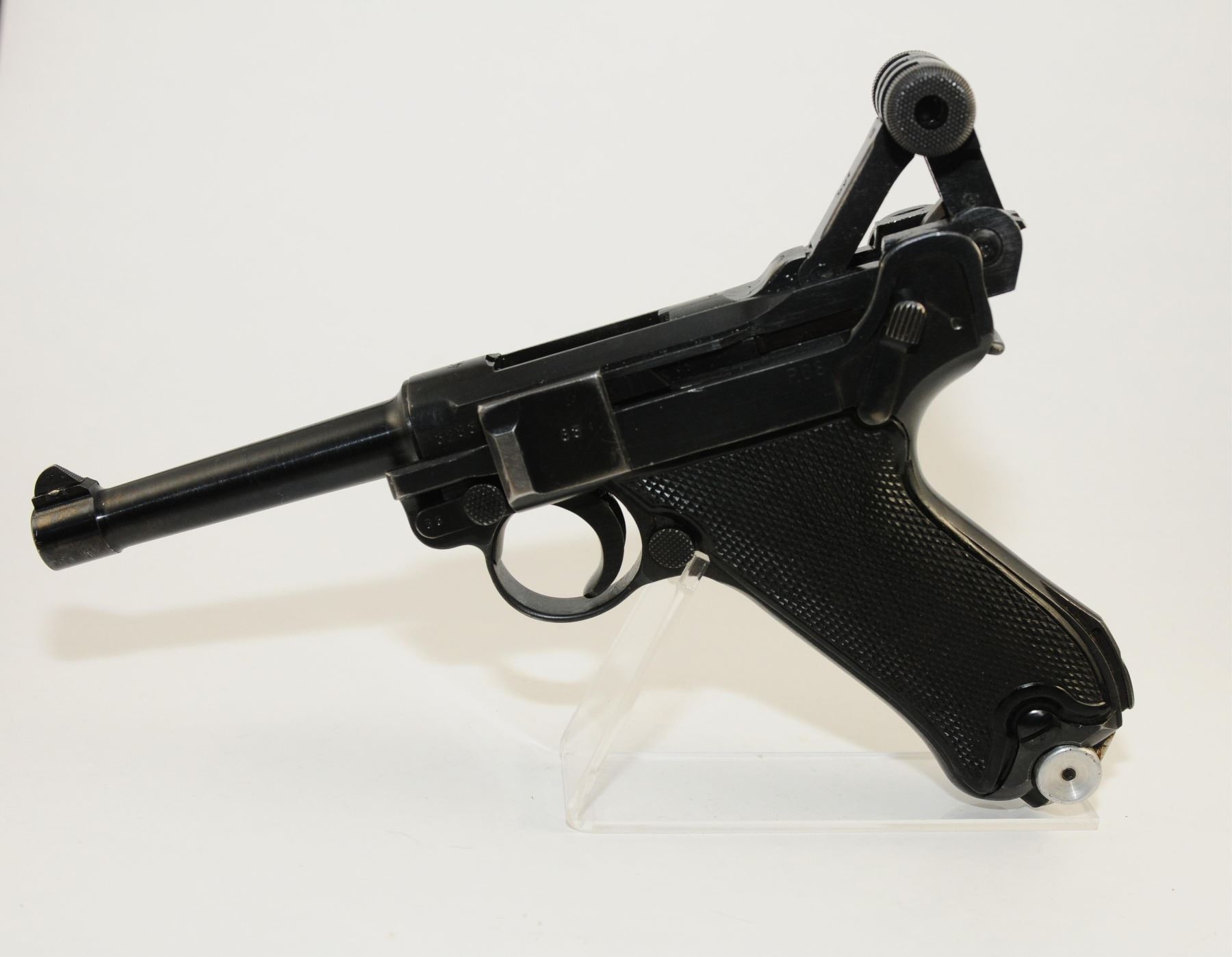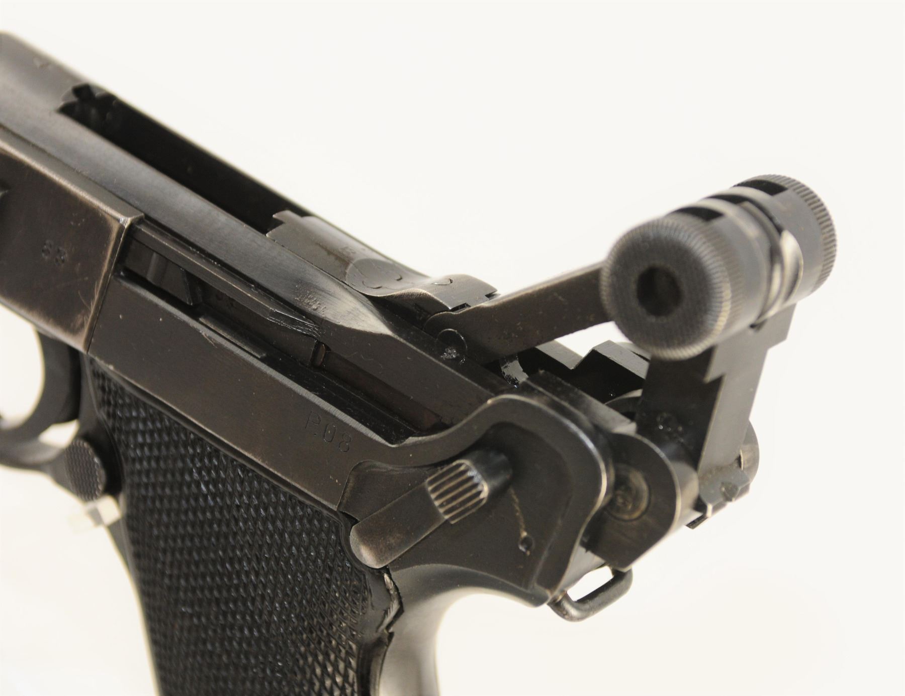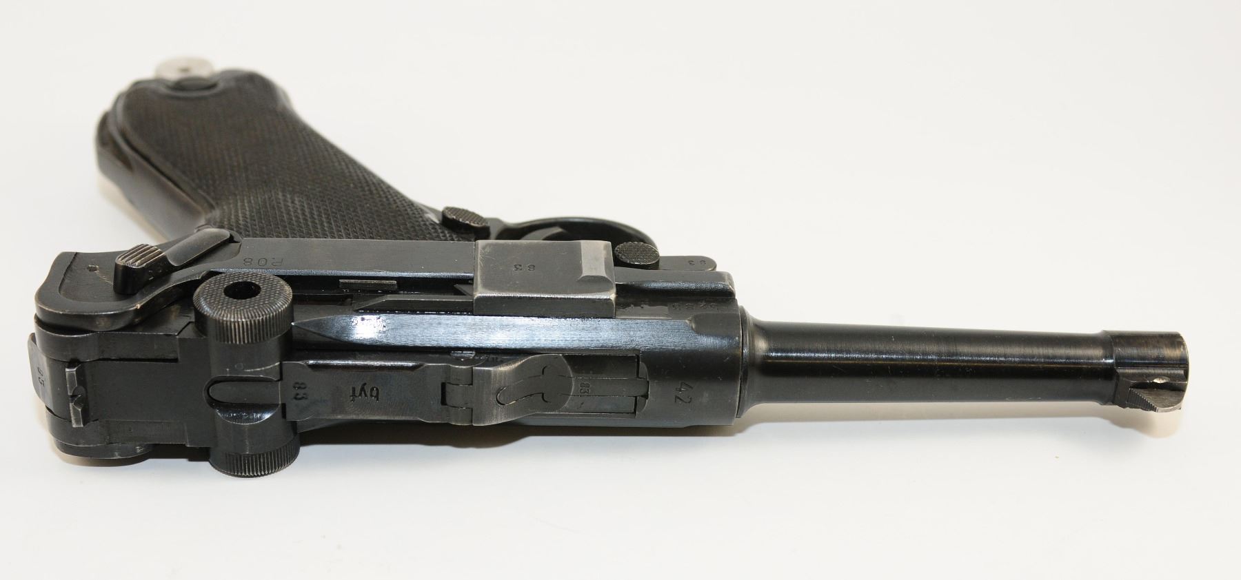 Restricted, semi auto, 9mm Luger, new 107mm barrel, SN 3283M. Plastic grips good, bluing worn from holstering, bore excellent. Comes with holster, take down tool, cleaning rod, lanyard loop and extra mag. Serial numbers