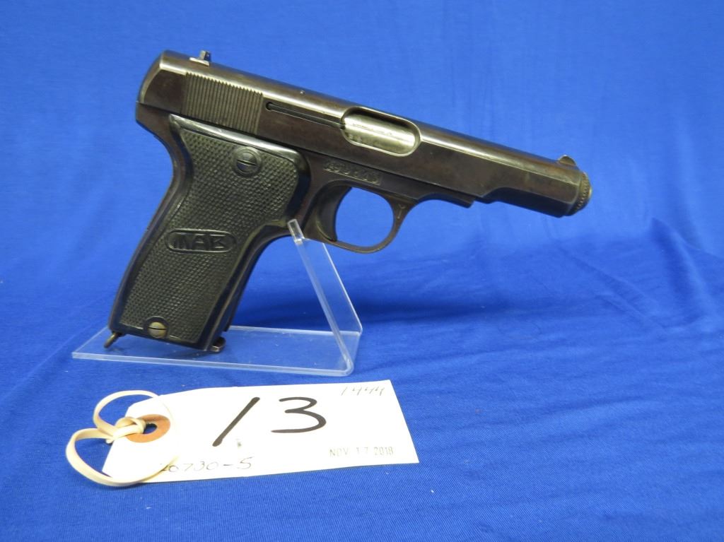 Prohibited, semi auto, 7.65mm, 102mm barrel, SN 105613. Plastic grips missing one screw. bluing is brown, bore very good. Comes with original cardboard box and manual.