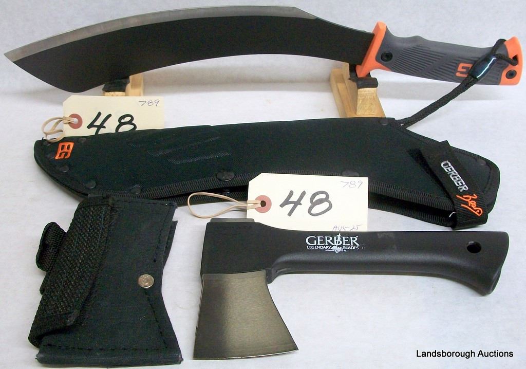 NEW GERBER PARANG MACHETE IN NYLON SHEATH AND NEW FISKARS HATCHET IN NYLON SHEATH.