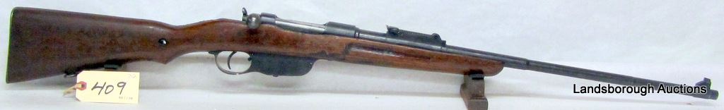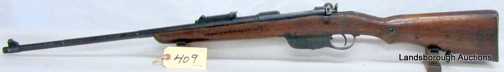 NON-RESTRICTED, BOLT ACTION, 8MM MAUSER, 24" BARREL, SN 41722. WOOD HAS NUMEROUS DENTS AND SCRATCHES, BLUING GREY, BORE GOOD WITH SOME DISCOLORATION.