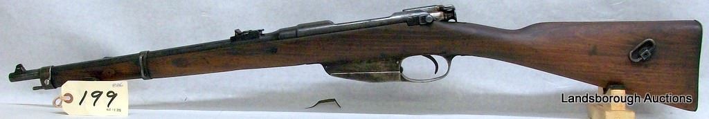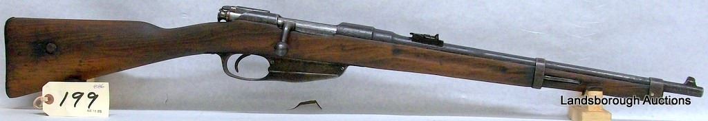 NON-RESTRICTED, BOLT ACTION, 6.5MM MANNLICHER, 18" BARREL, SN C777. WOOD HAS A GOUGE AND A COUPLE MARKS, BLUING BADLY PITTED AGAINST WOOD, BORE EXCELLENT.
