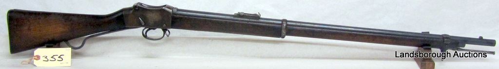 ANTIQUE, SINGLE SHOT, 577/ 450 MARTINI HENRY, 33" BARREL, SN 408. WOOD HAS NUMEROUS DENTS, GOUGES AND SCRATCHES, BLUING IS BROWN, BORE GOOD. DATED 1887.