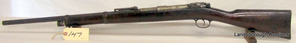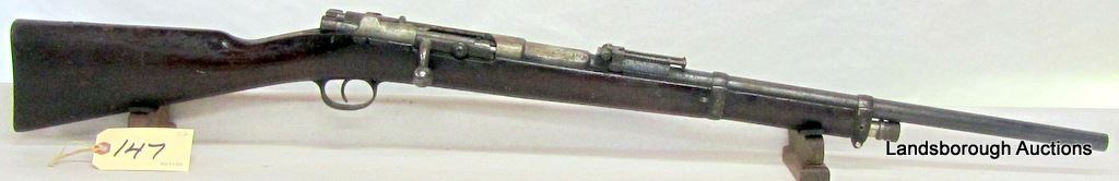 NON-RESTRICTED, SINGLE SHOT, 43 MAUSER, 24" BARREL, SN 1889. WOOD HAS NUMEROUS MARKS, SCRATCHES AND DENTS, BLUING GONE OR RUSTY, BORE SHINY WITH PITTING.
