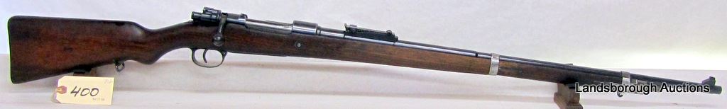 NON-RESTRICTED, BOLT ACTION, 7M MAUSER, 30" BARREL, SN 55527. TOP WOOD MISSING, STOCK HAS NUMEROUS DENTS AND MARKS, BLUING GREY AND WORN, BORE VERY GOOD.