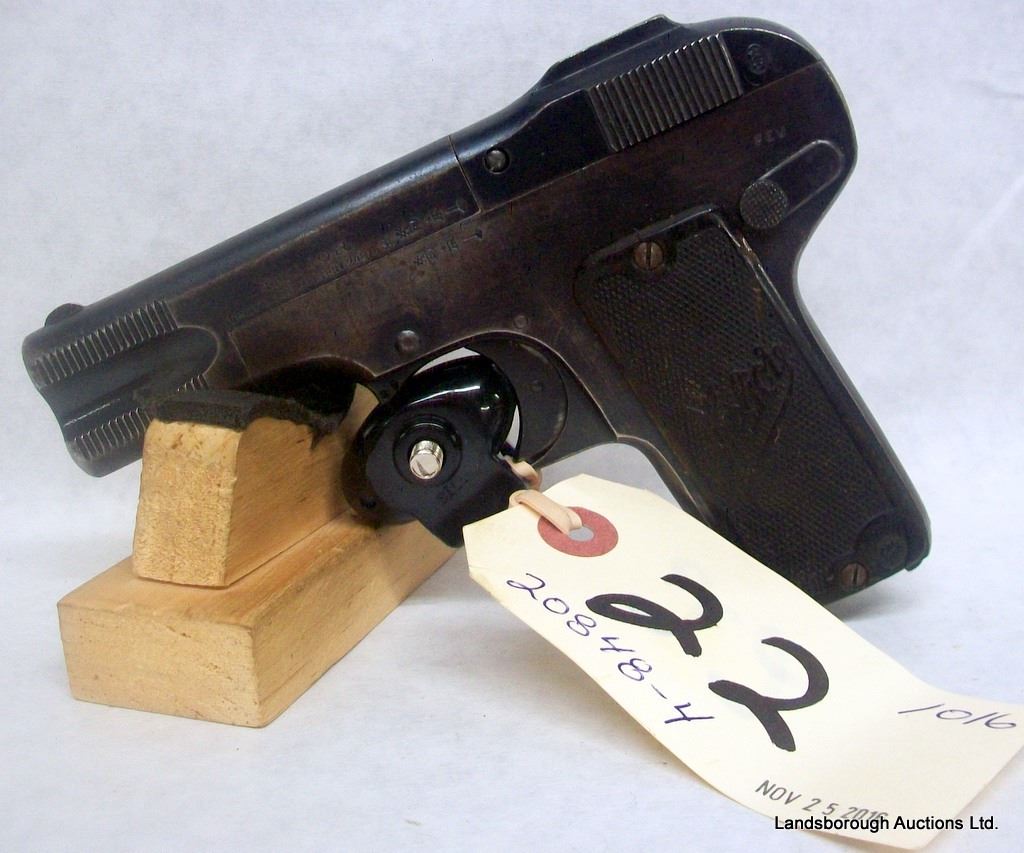 PROHIBITED, SEMI AUTO, 7.65MM, 90MM BARREL, SN 26663. RIGHT GRIP IS WOOD AND SSCRATCHED, LEFT GRIP HARD PLASTIC WITH MARKS, BLUING WORN AND GREY, BORE STAINED. NO MAG.
