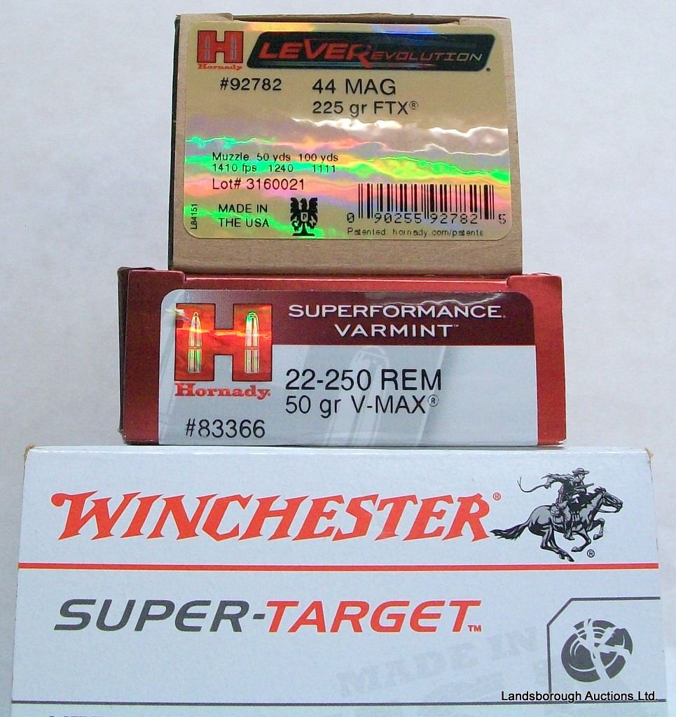 25 RNDS WINCHESTER 12GA X 2 3/4", 20 RNDS HORNADY 44 MAGNUM 225 GRN, 20 RNDS SUPERFORMANCE 22-250 REM 50 GRN VMAX.