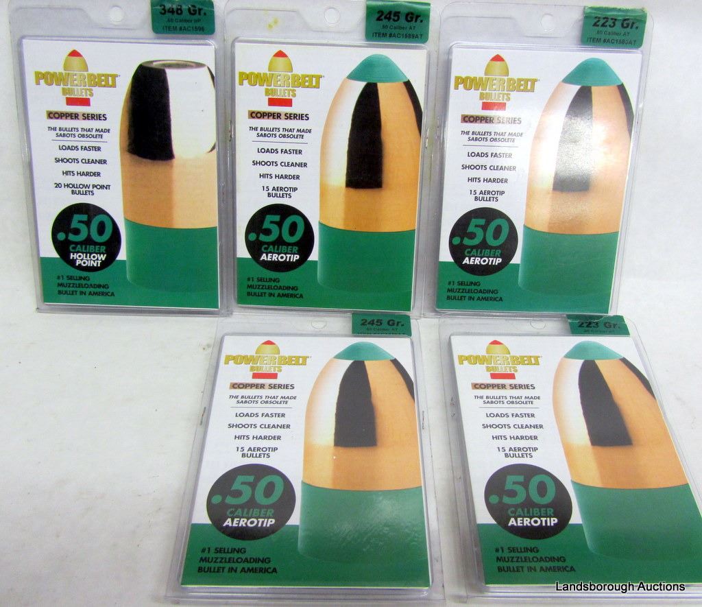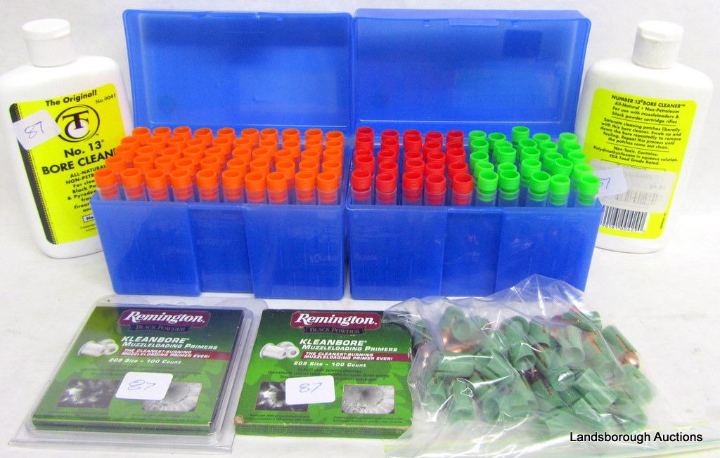 50 CAL SABOTS, POWDER VIALS, BORE CLEANER, REMINGTON 209 PRIMERS (147 PCES). 52 AEROTIP AND 17 HOLLOW POINT.