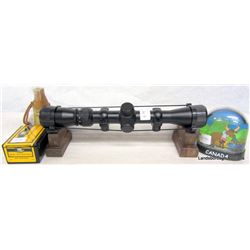 TASCO 3-9 X 32 SCOPE WITH TIP OFF RINGS AND COVERS, 57 CAL LEAD BALL, CAROLINA LED HEAD LAMP, TWO FLINTS, NIPPLE WRENCH, FOLDING KNIFE 3 1/2 IN BLADE,