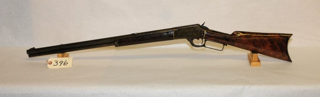 Non-restricted, lever action, 32-20 Win, 24" barrel, SN 108362. Wood refinished and patched, bluing is grey and has been lacquered, bore dark and pitted, rifling evident.