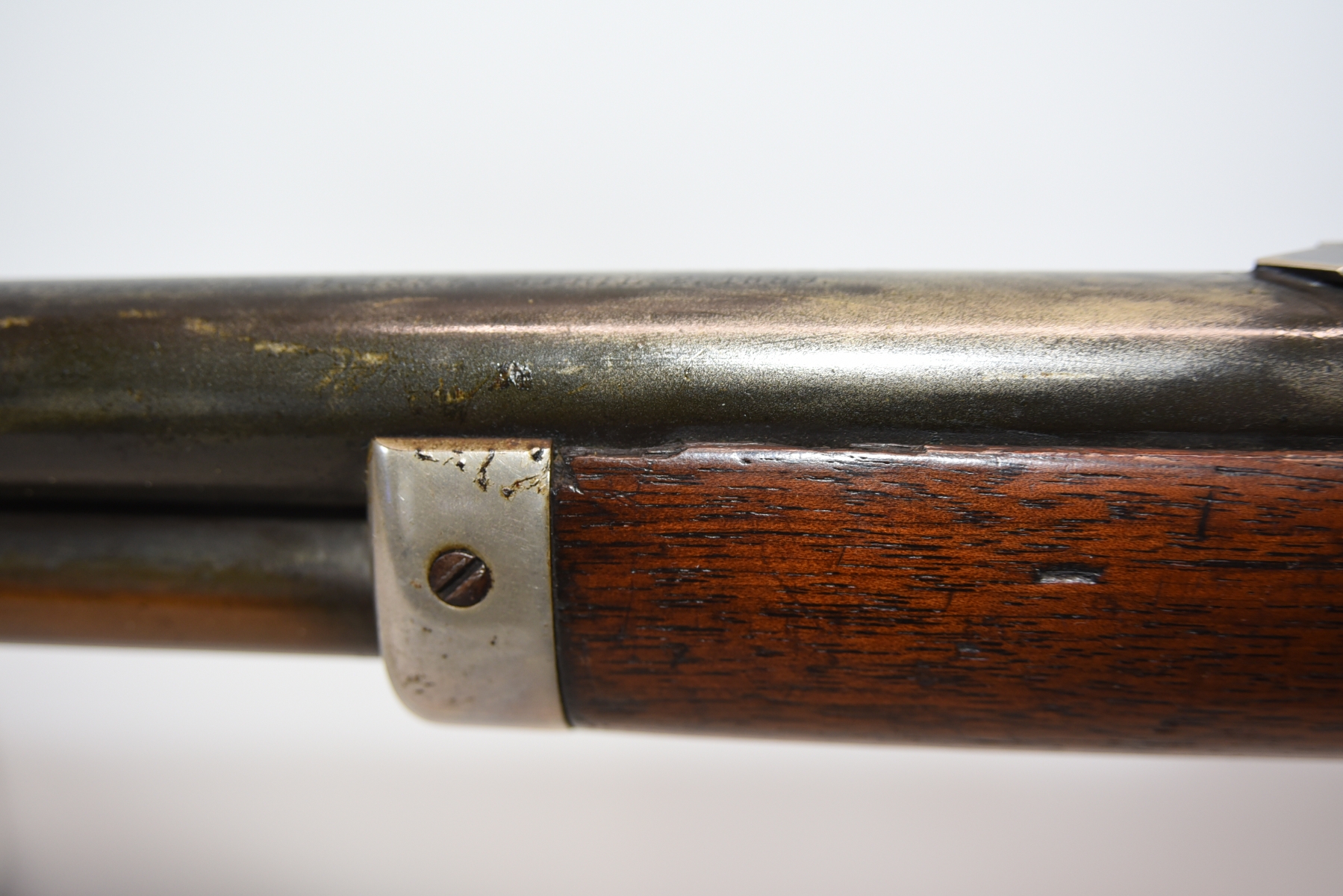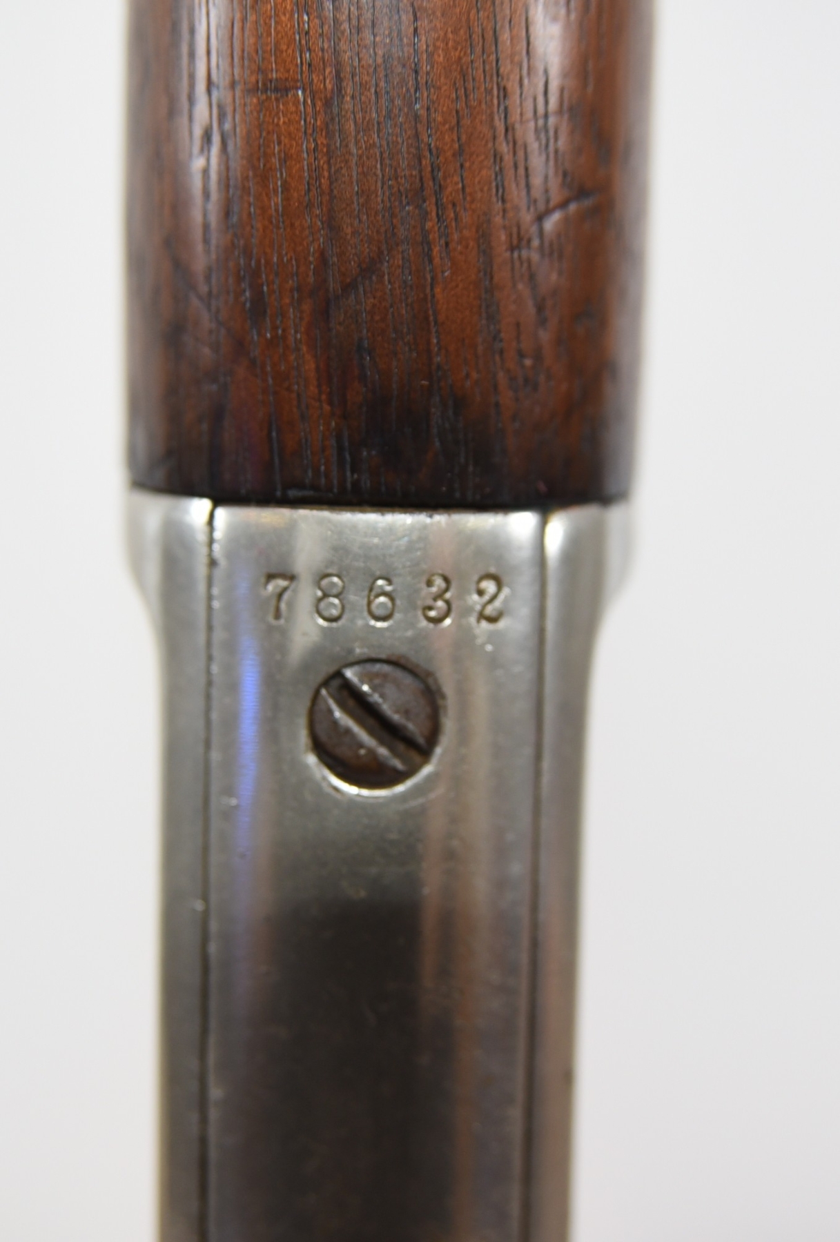 Metal shows a worn finish, scratches and scuffs, tarnish, patina on various areas throughout, there are dents on the magazine tube. There is clear varnish type material on the metal. Condition is fair for age.
