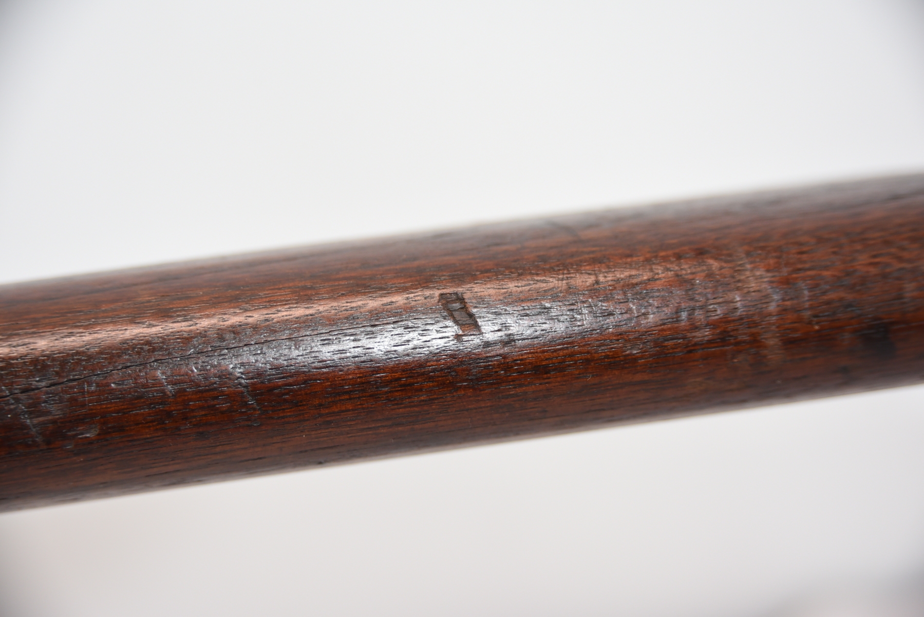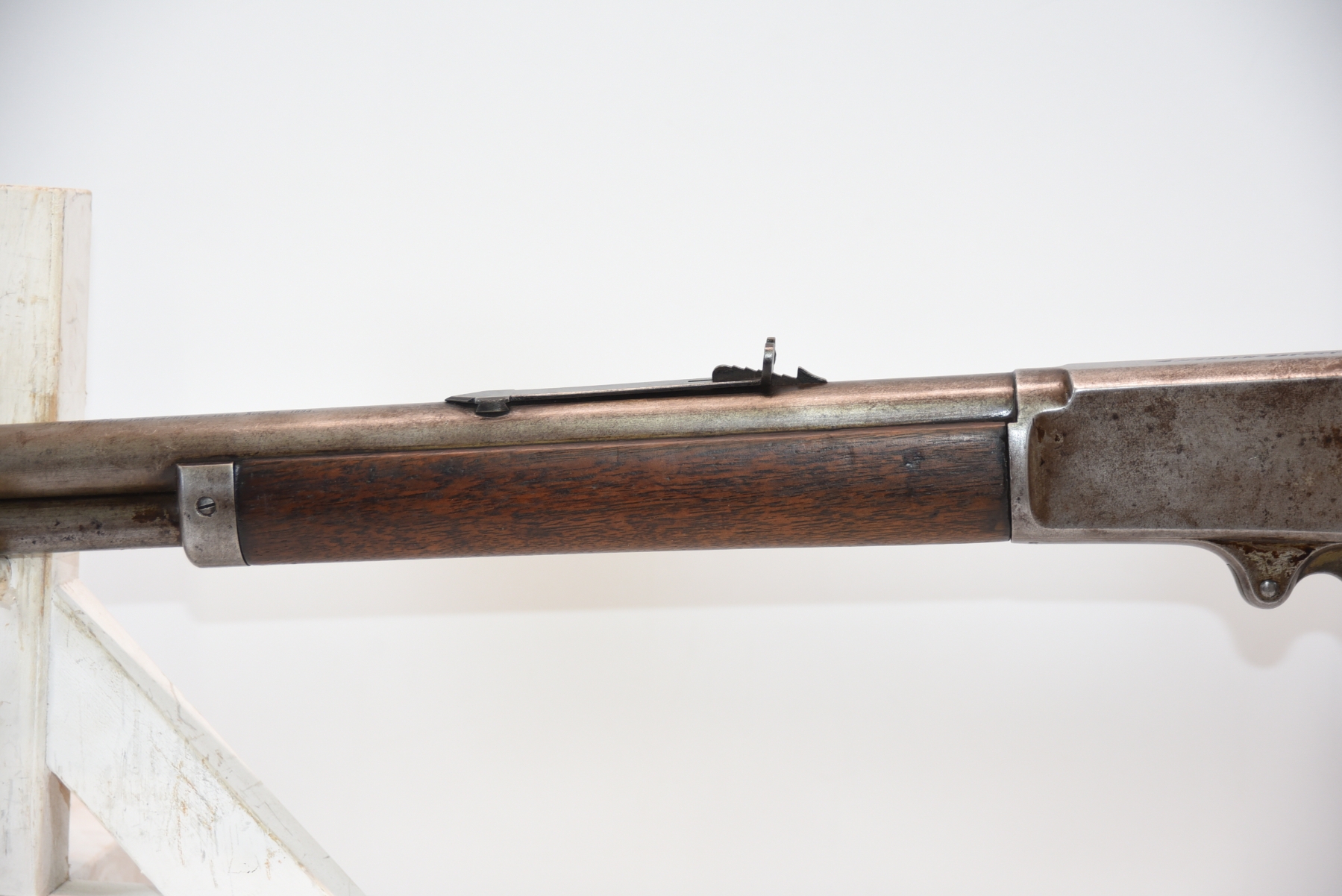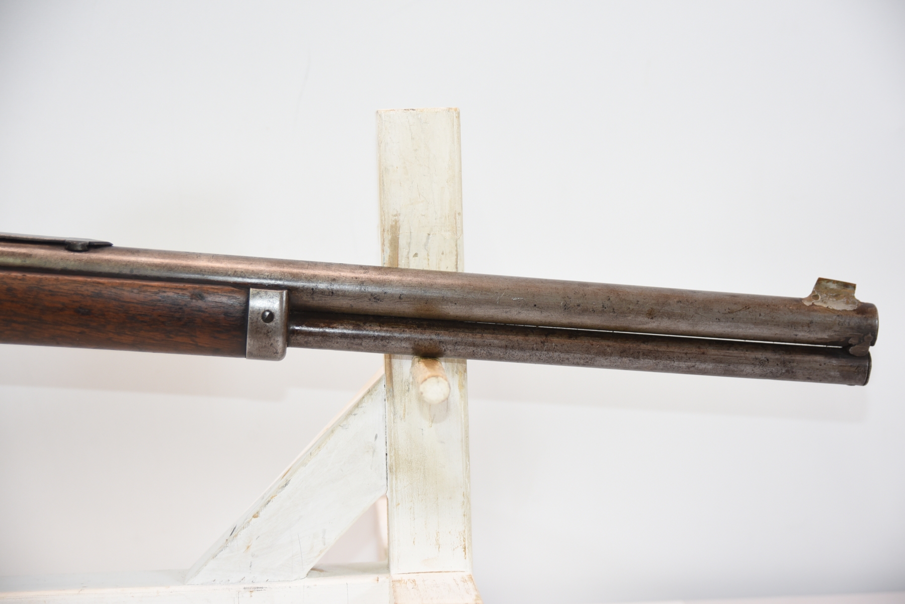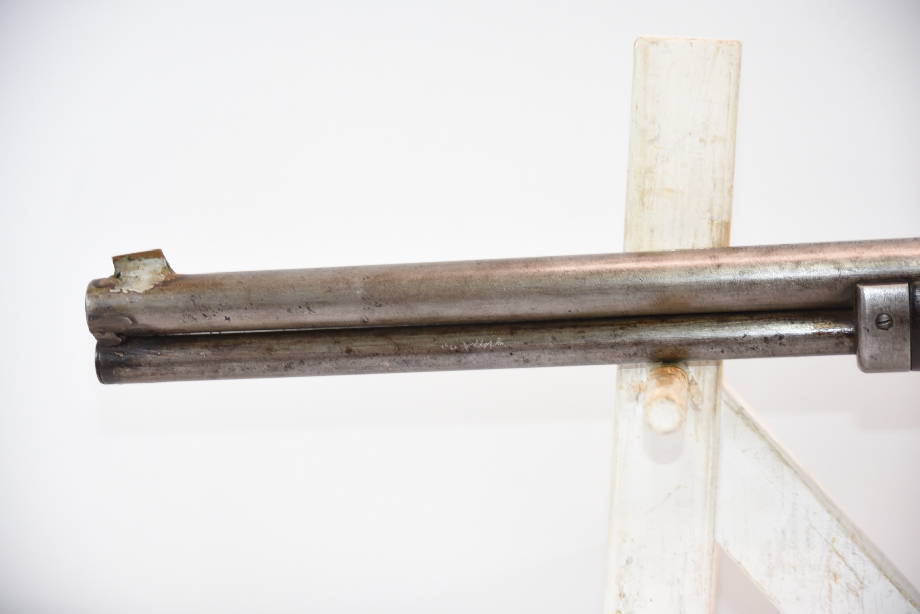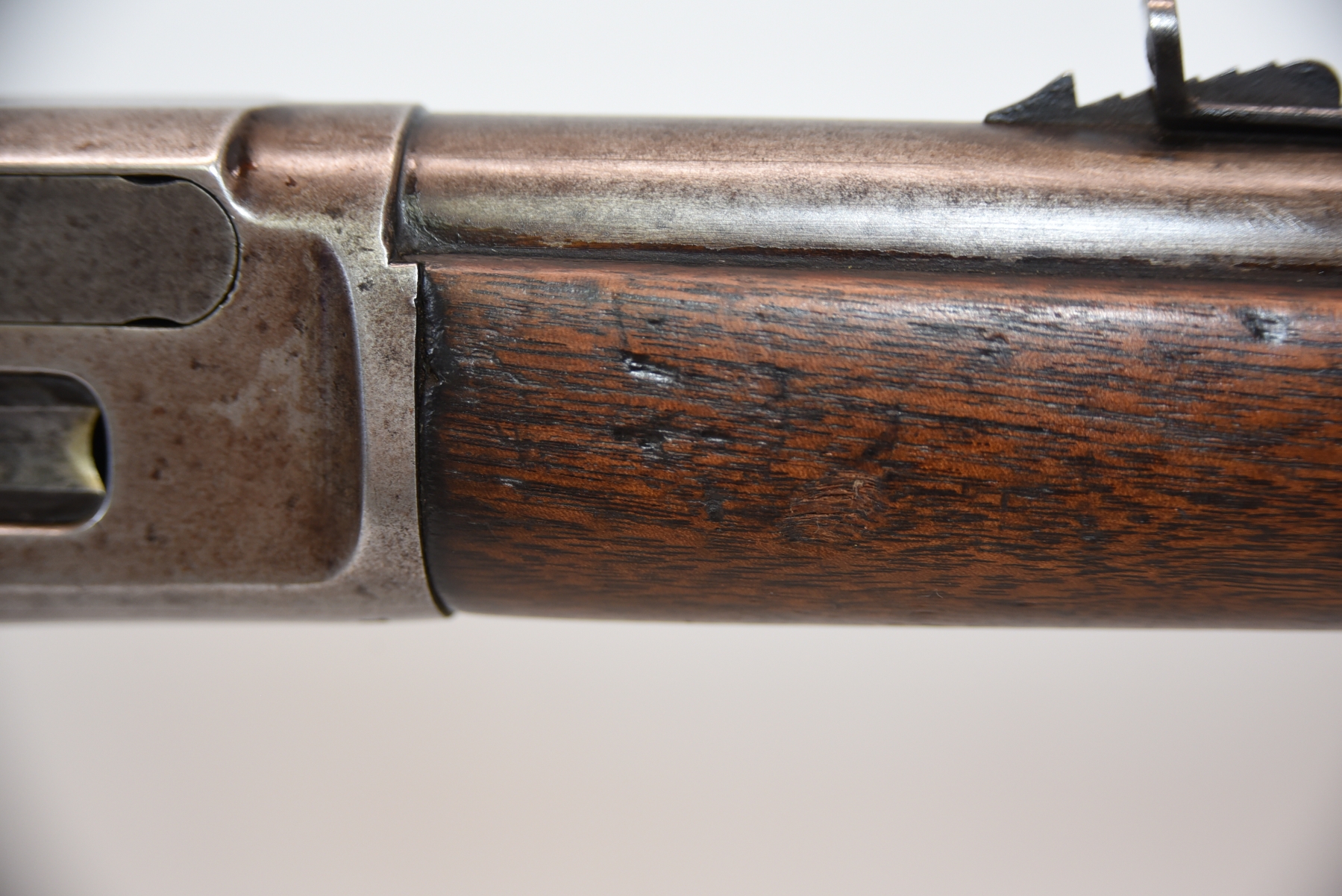 Metal shows patina, front sight has been soldered as has the magazine tube by muzzle with tool marks to grind the weld down, there are scratches, and scuffs, few rust specks, bluing is completely worn; condition is fair for age.
