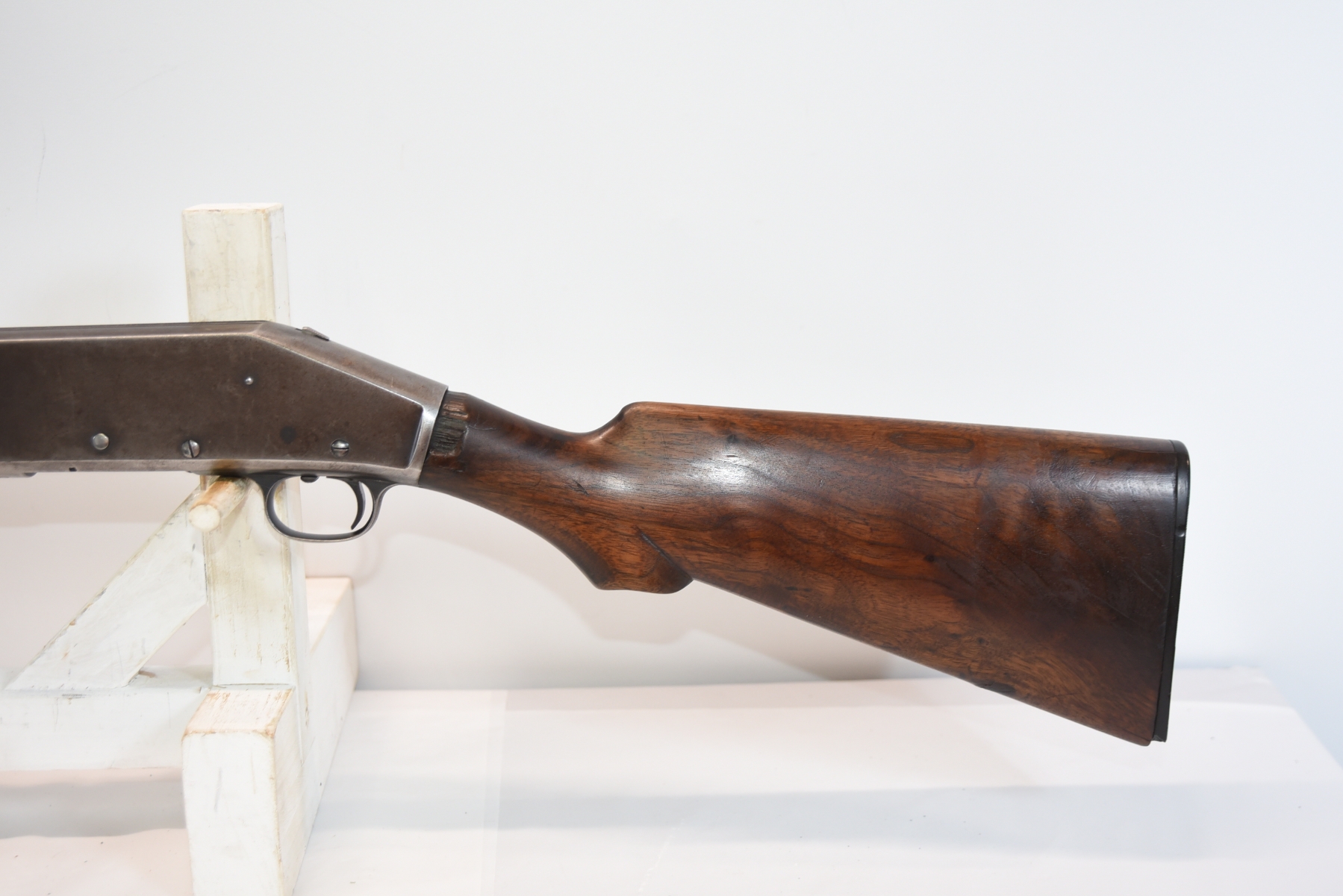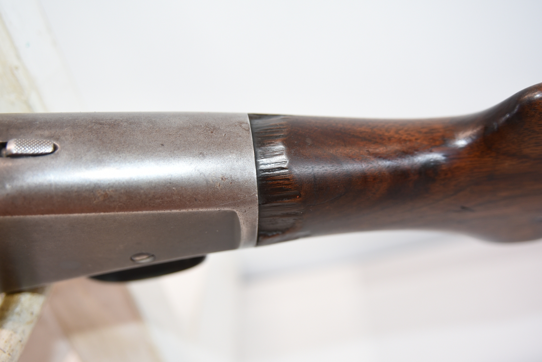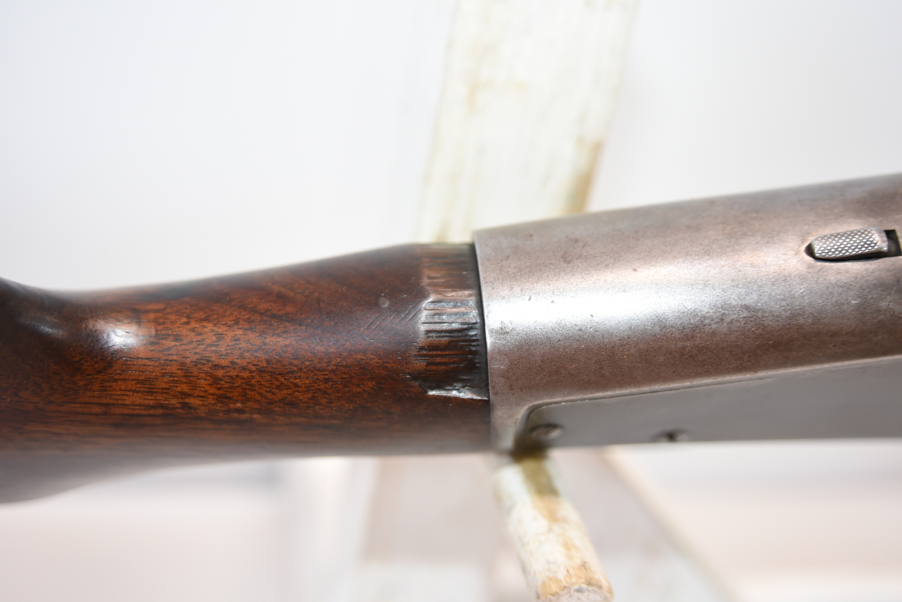 Wood stock shows chips in the upper grip/receiver area, butt plate has chips, there are scratches, scuffs and dents; condition is fair for age.