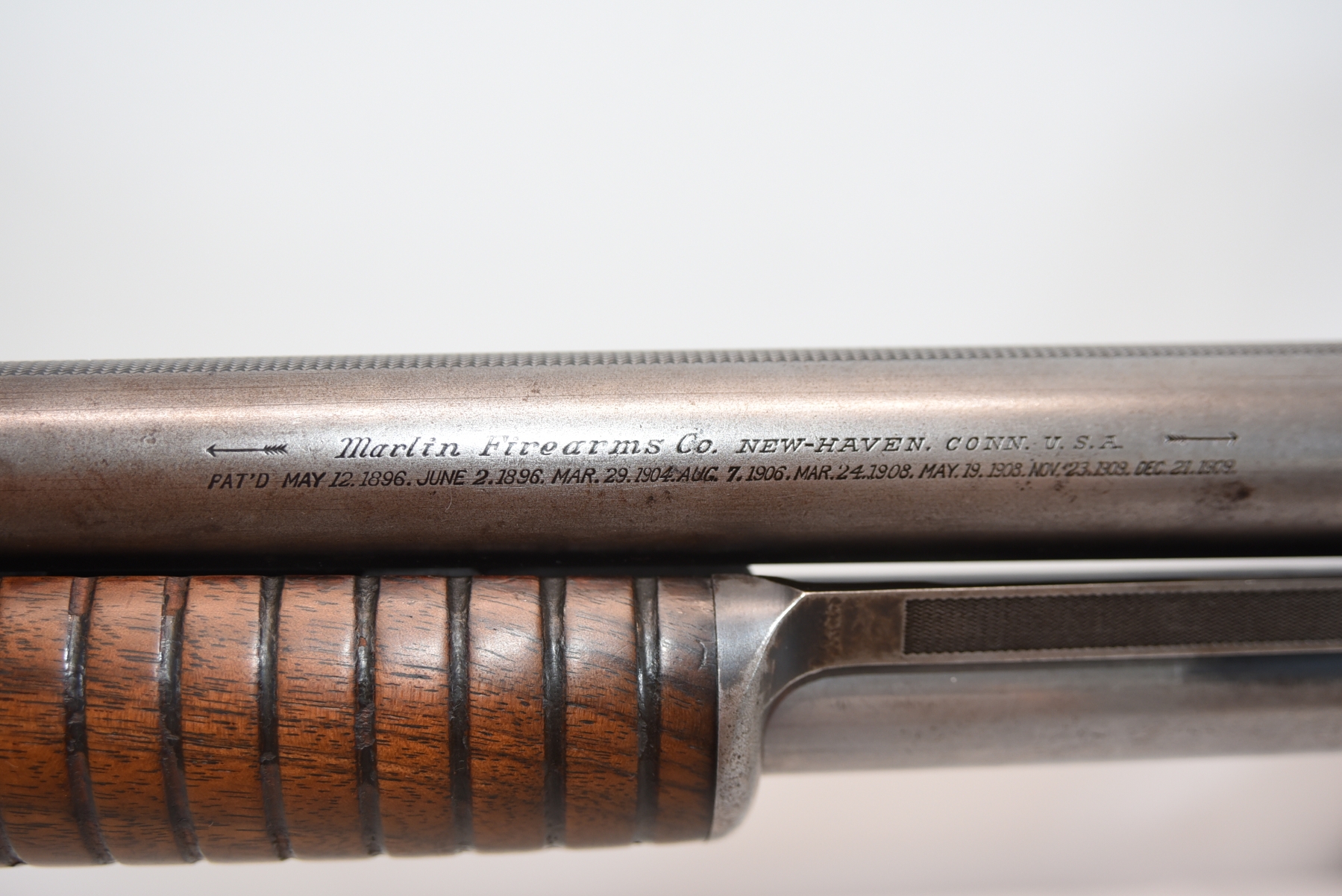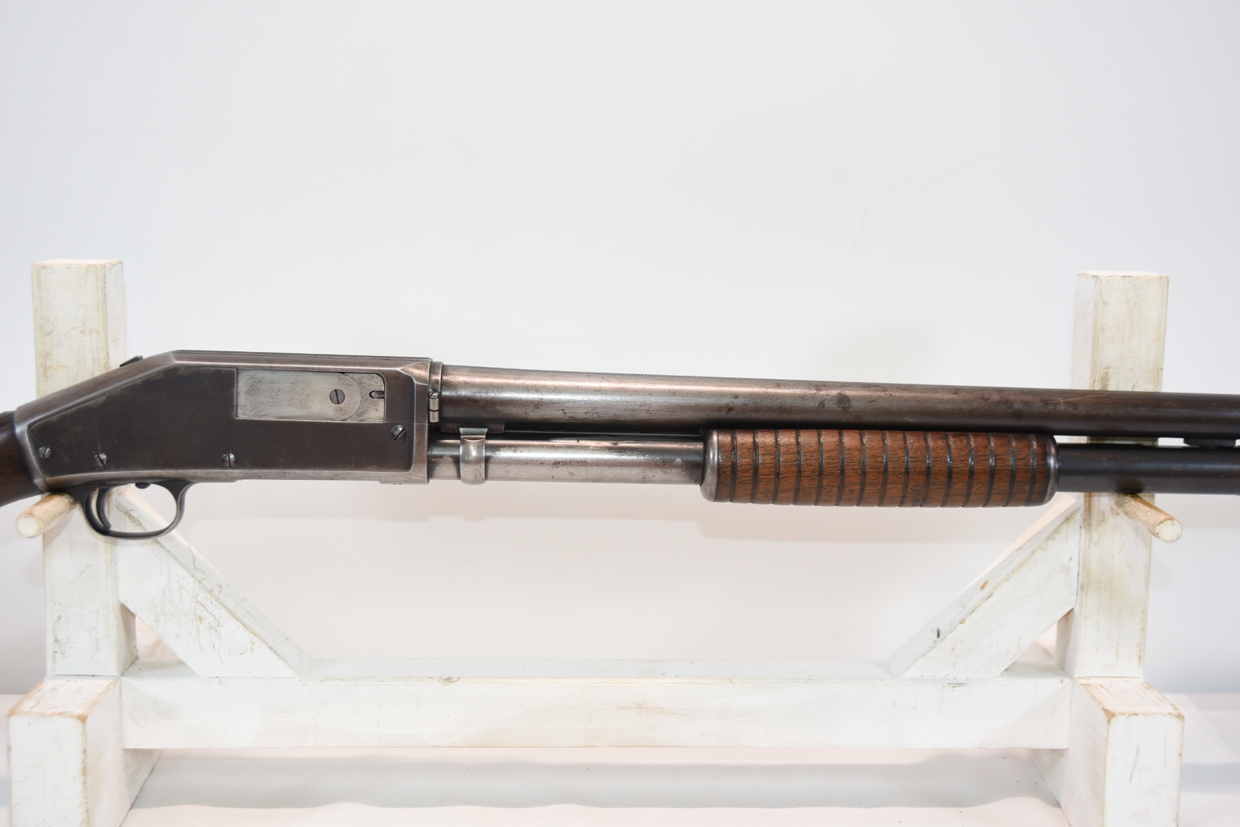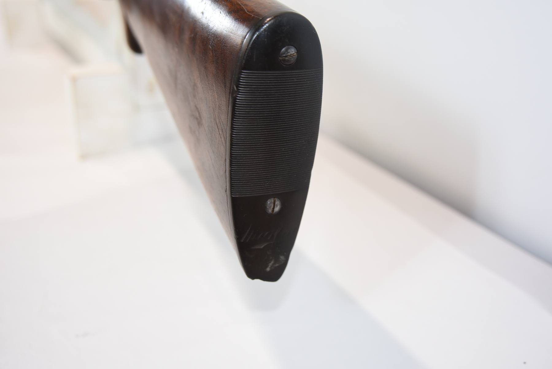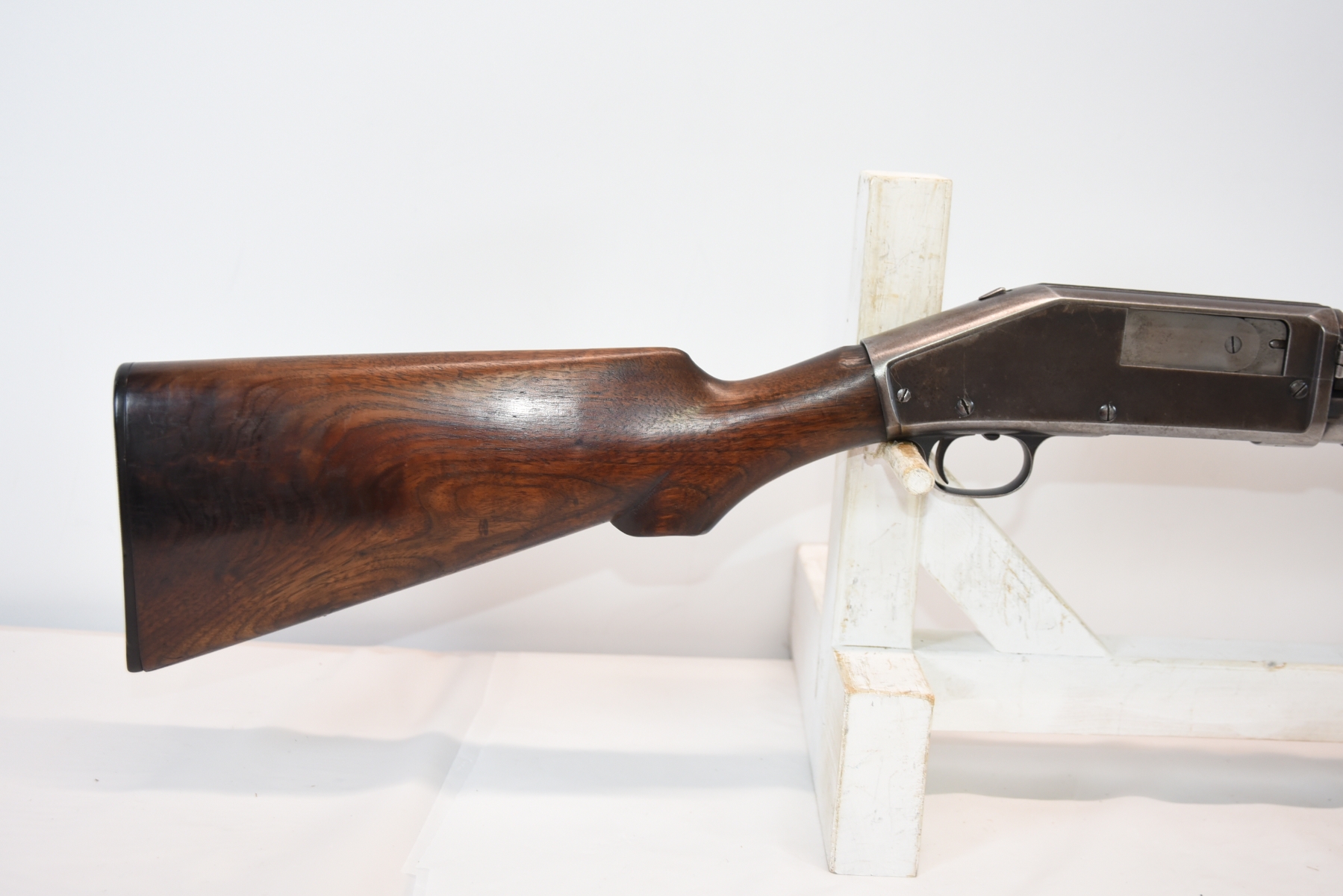 Wood stock shows chips in the upper grip/receiver area, butt plate has chips, there are scratches, scuffs and dents; condition is fair for age.