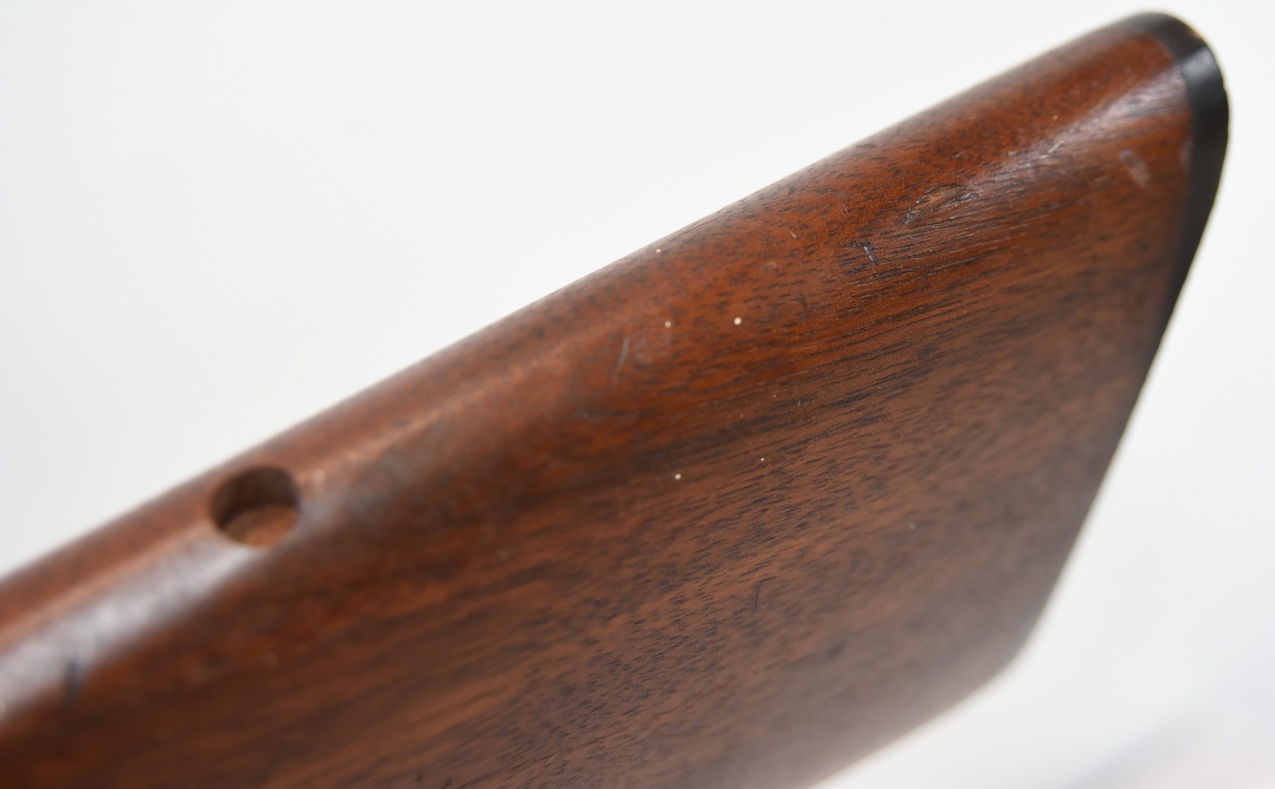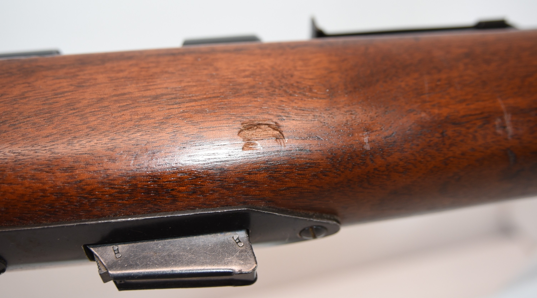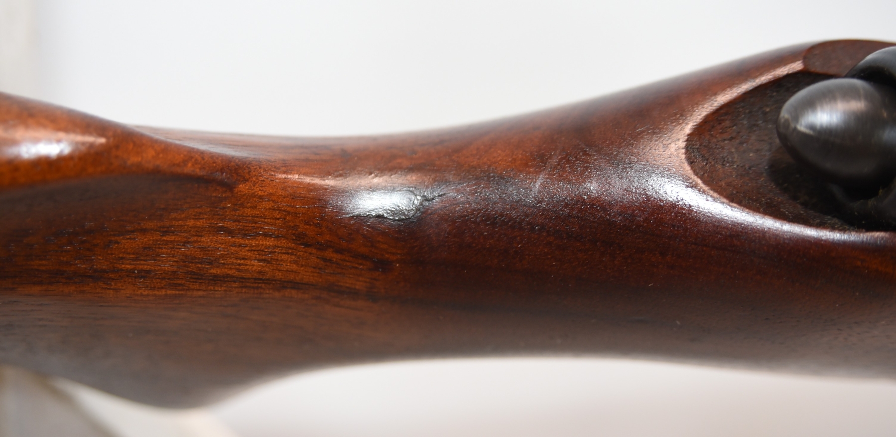 Metal shows some varnish spots on barrel and receiver, light scratches, scuffs; condition is very good.