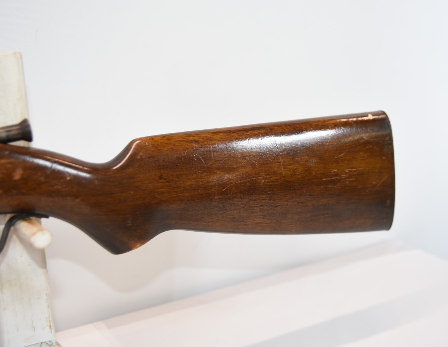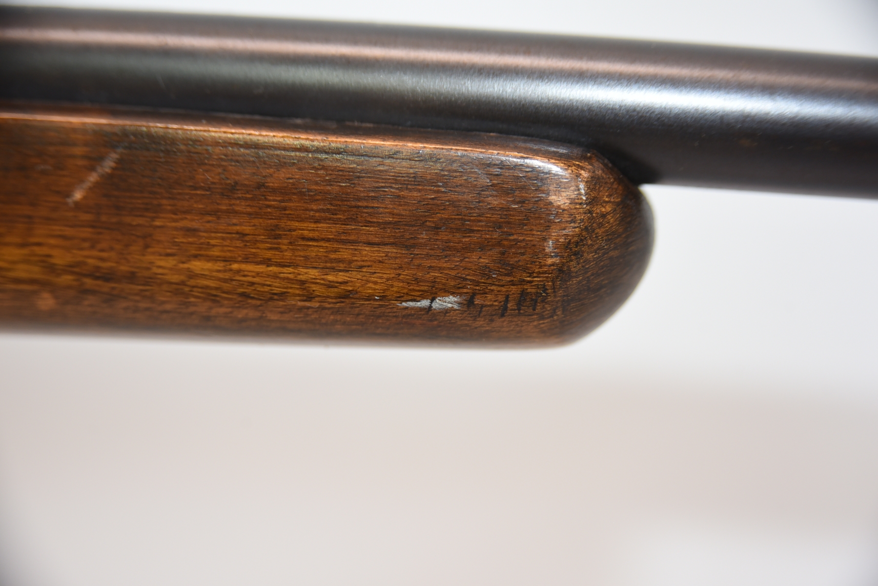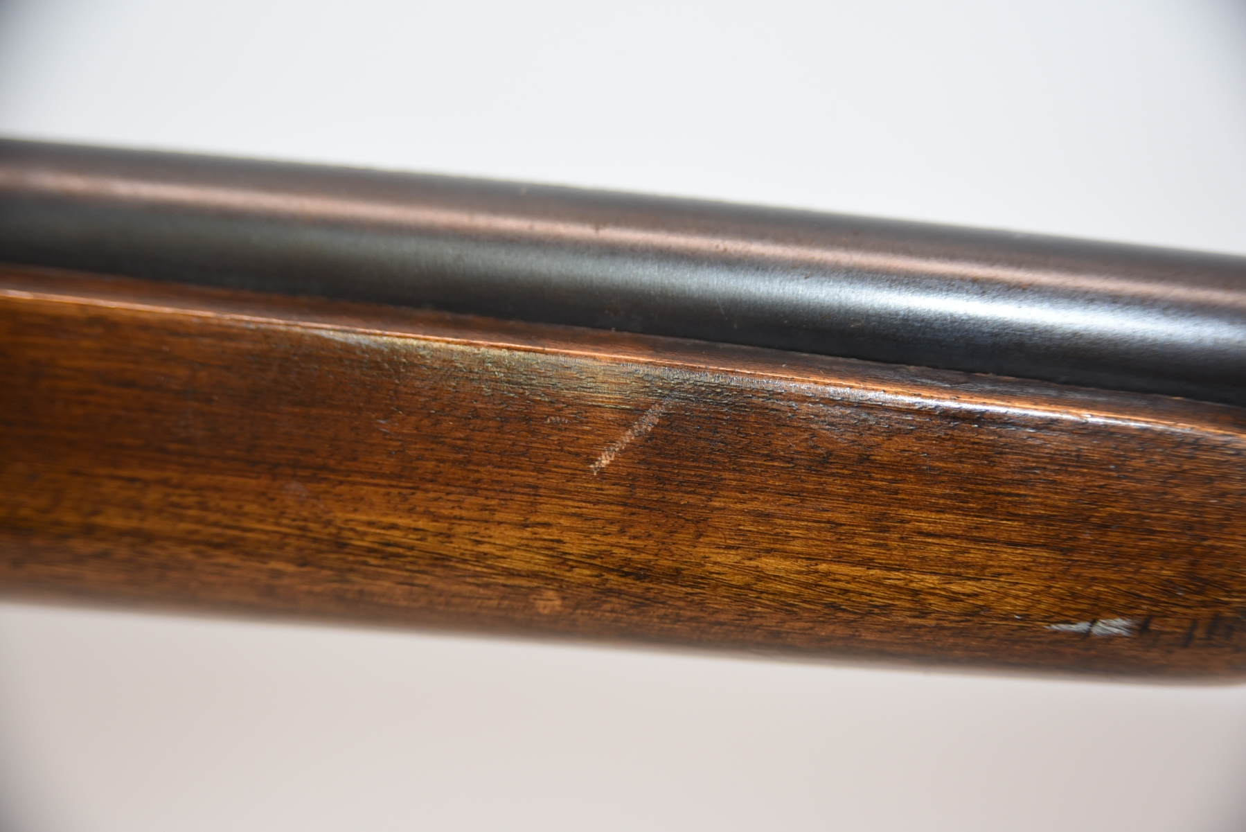 Wood stock shows scratches, scuffs, finish wear, light dents in various areas; condition is good.