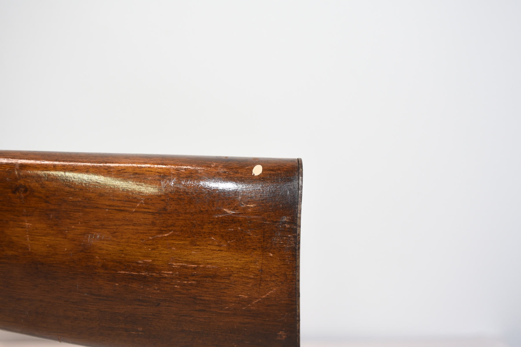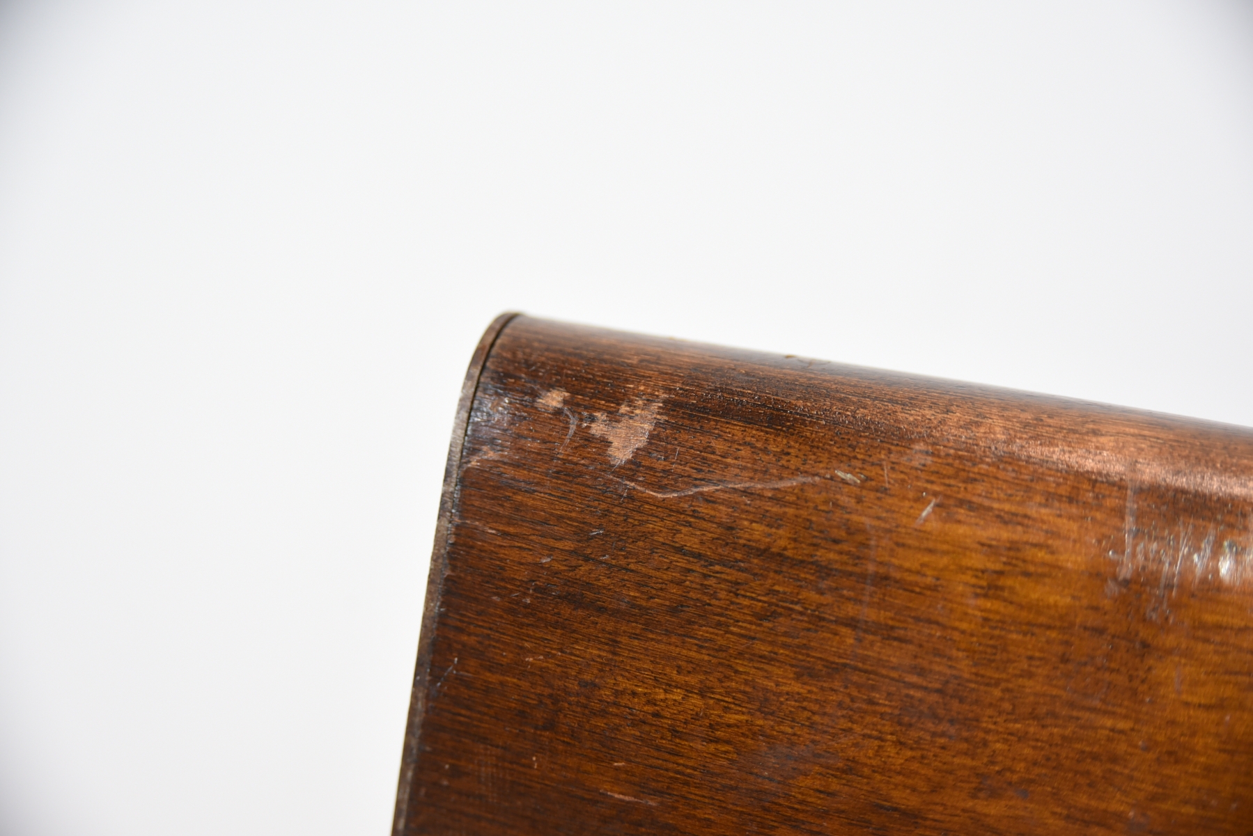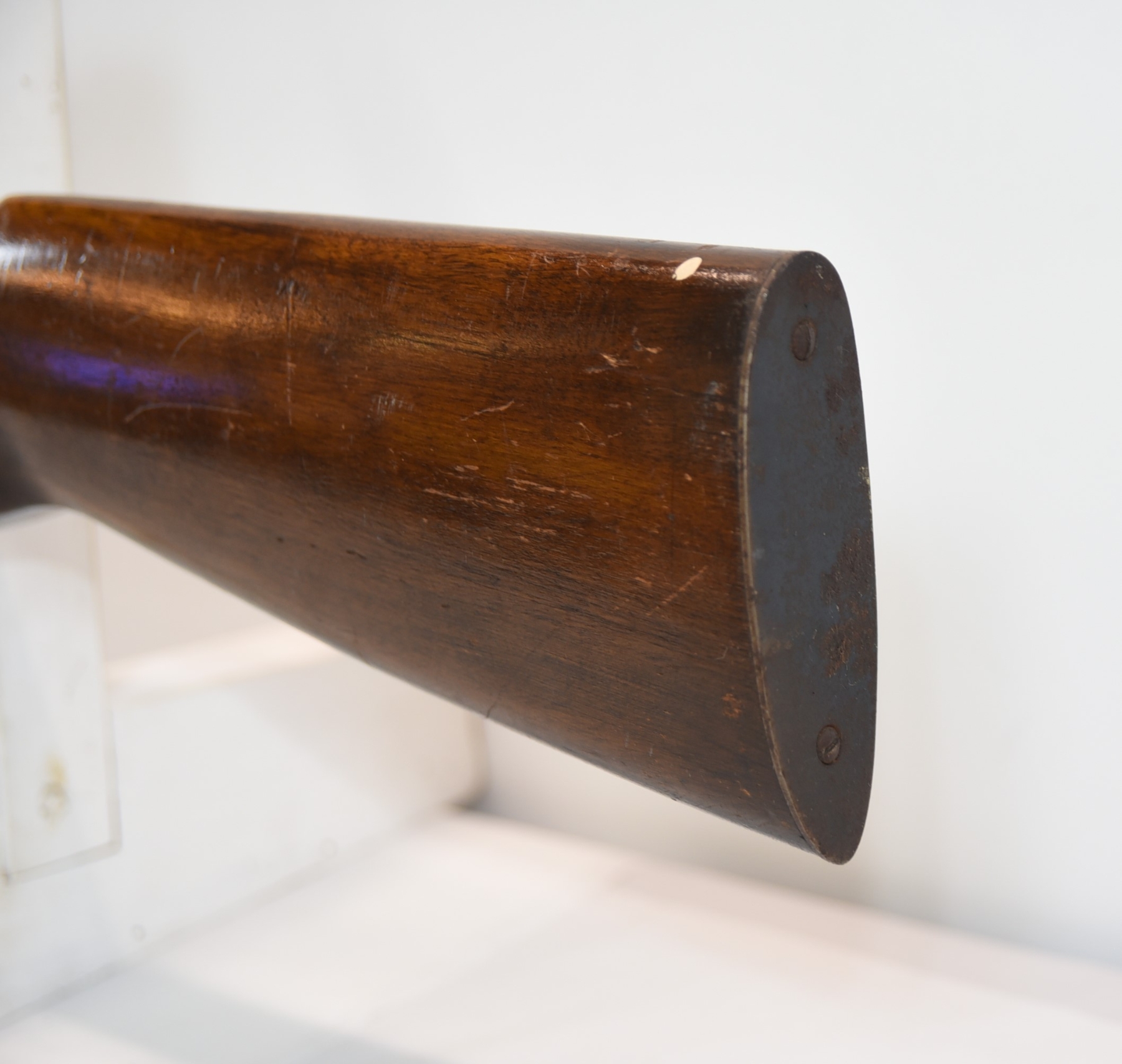 Wood stock shows scratches, scuffs, finish wear, light dents in various areas; condition is good.