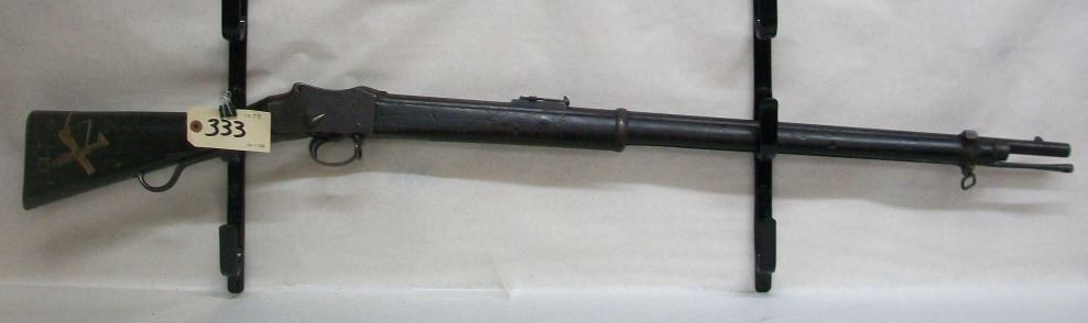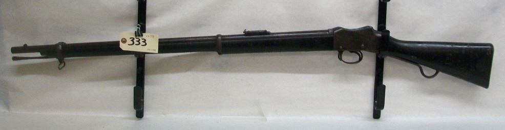 Non-Restricted, lever action Martini action, 450/577, 33 inch barrel, Ser# NONE, wood is fair with rack marks and dents, blueing is poor with corrosion and pitting on receiver, bore is poor with rifling evident.