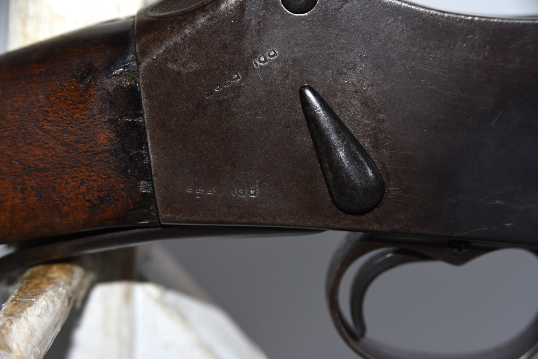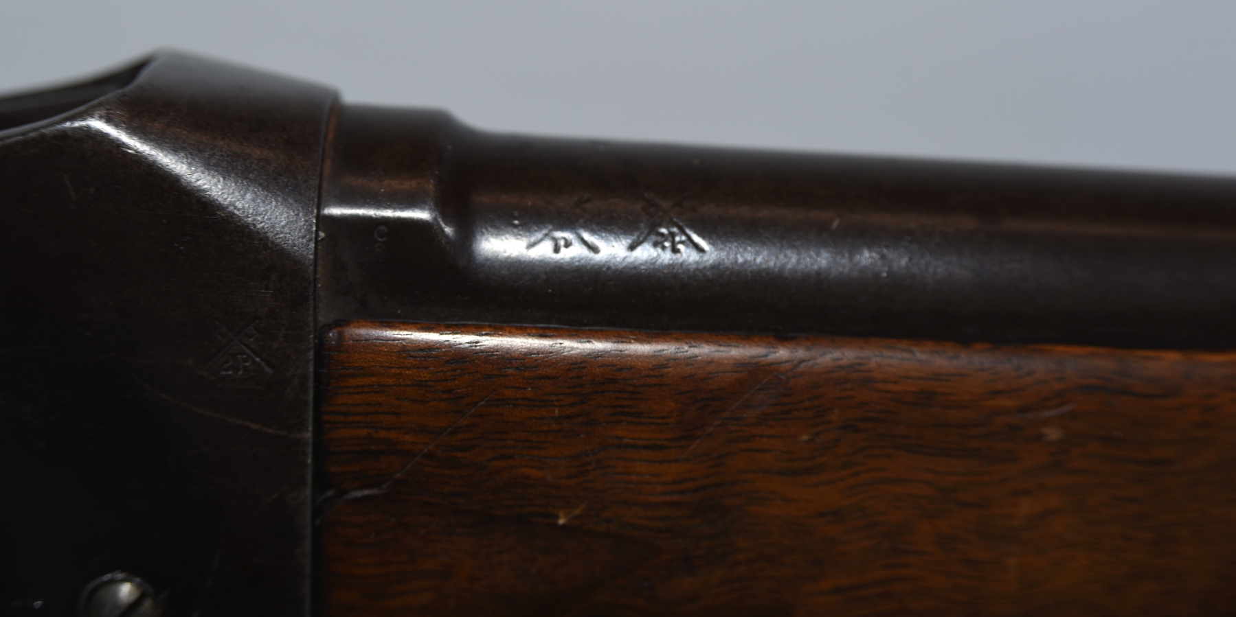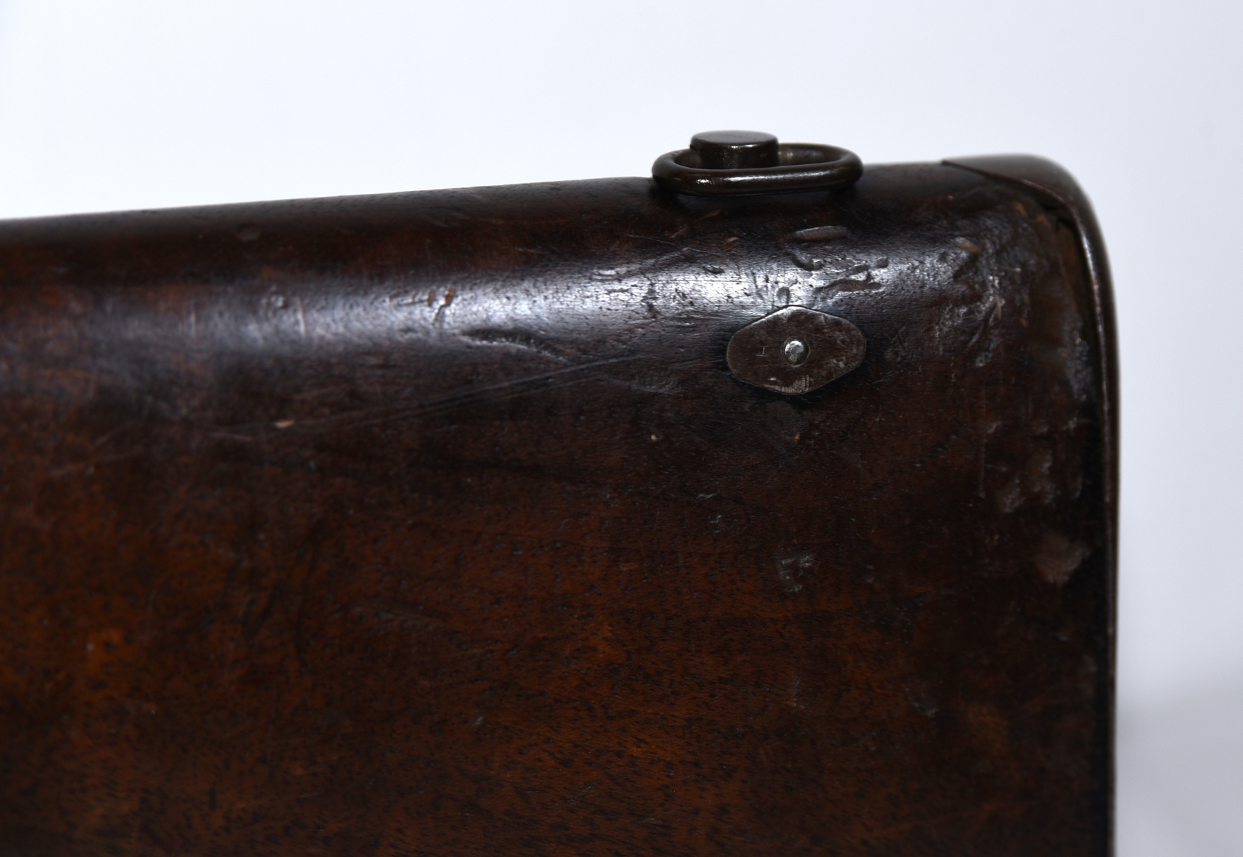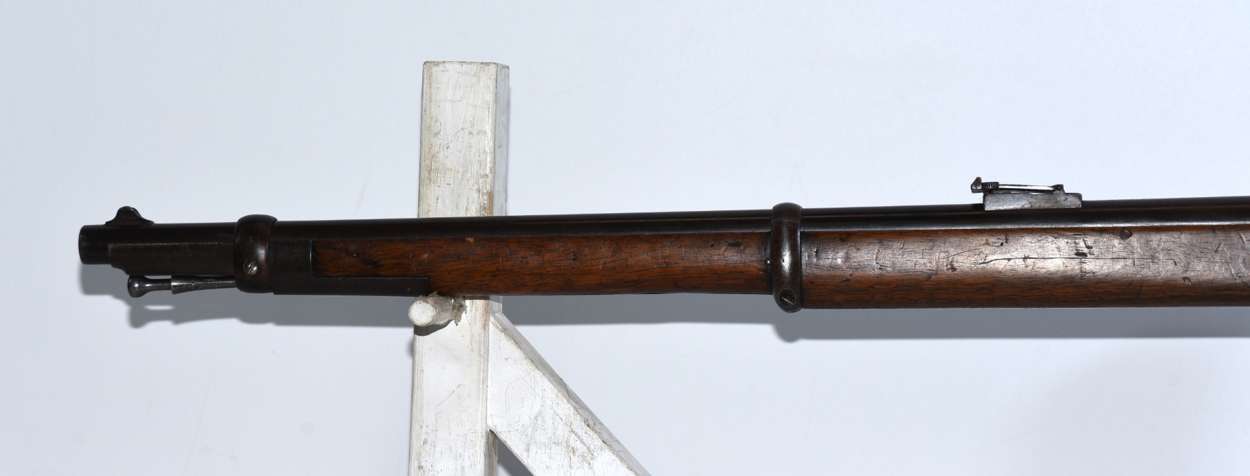 Wood stock shows lots of scratches, scuffs, dents, rear stock fits loose, rear sling swivel is mounted on top of rear stock; condition is fair.