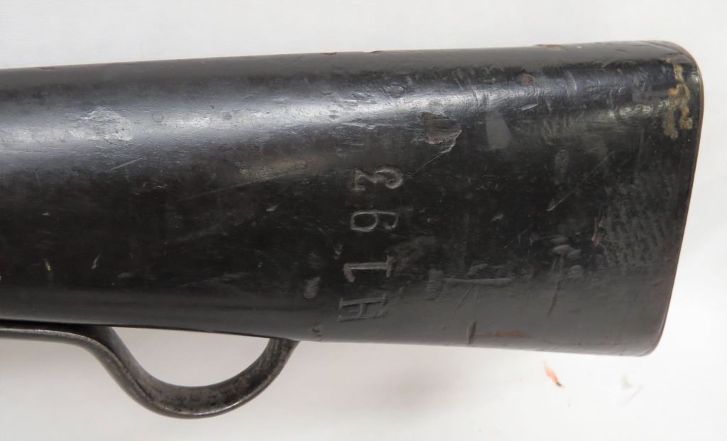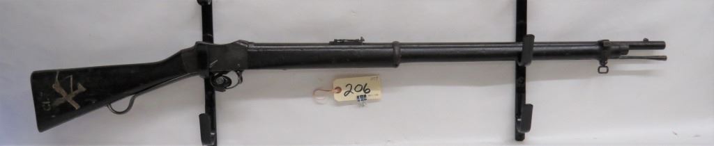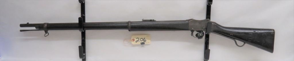 Antique, single shot long lever, 577/450 Martini Henry, 33" barrel, SN none, wood has dints and scratches, bluing is brown and has some corrosion on the receiver, bore is dark rifling prominent, markings on receiver are a crown V.R Enfield 1887 small crown with arrow pointing down I.V 1., markings on stock are H193.