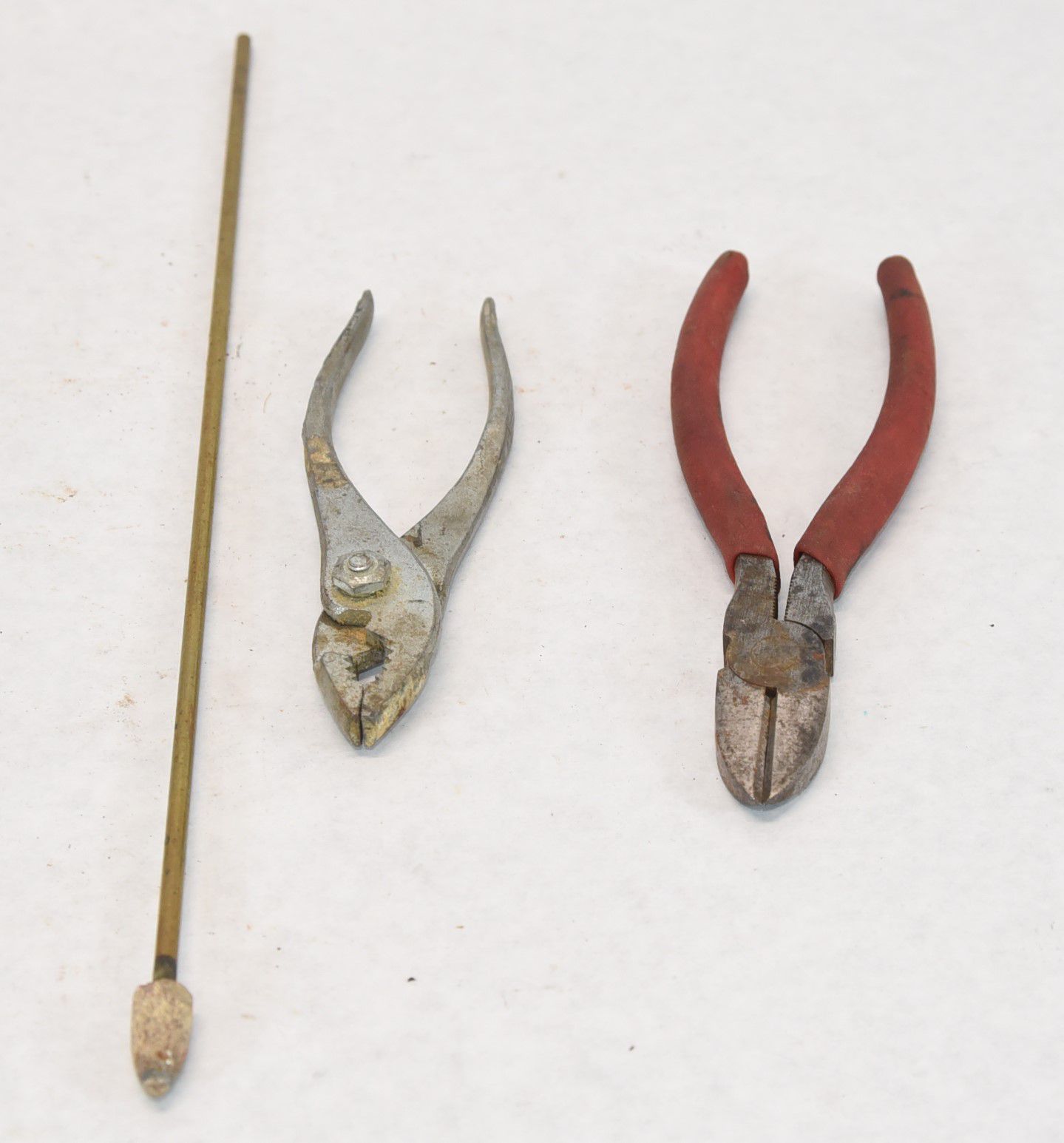 Mastercraft metal tool box with tray- 16"x 6"x 5" with pliers, channel locks, side cutters, tin snips, needle nose pliers. Some items have rust.