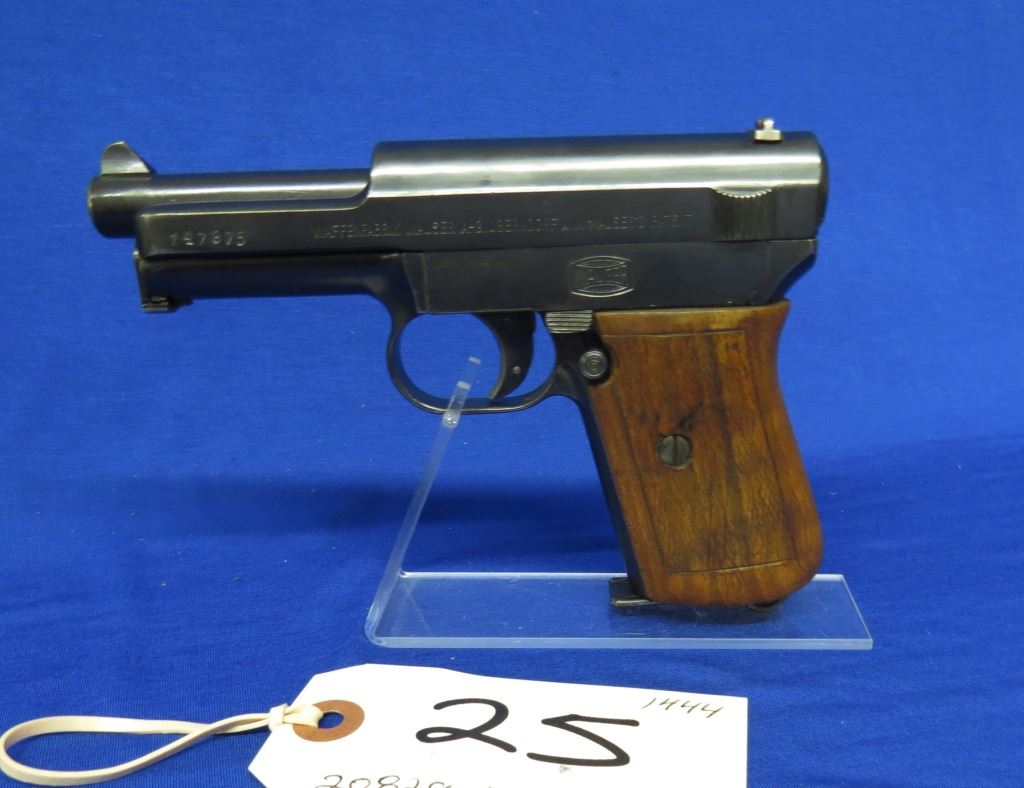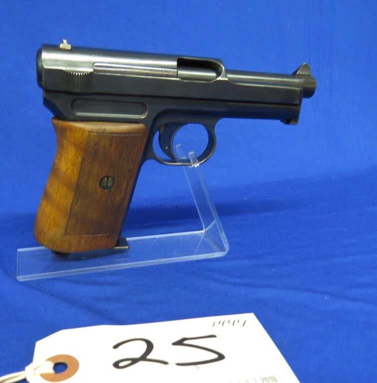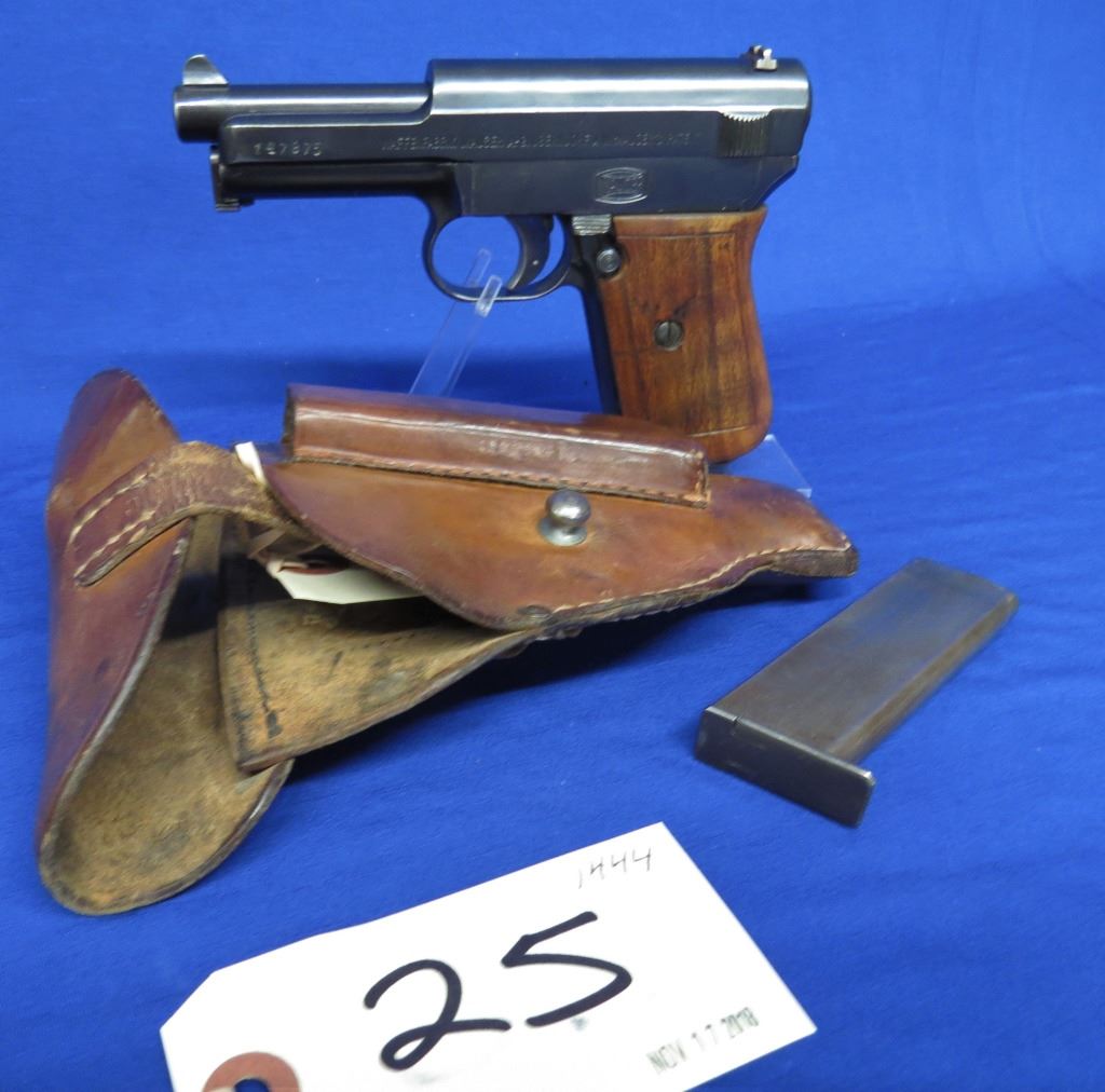 Prohibited, semi auto, 7.65mm, 89mm barrel, SN 147875. Wood grips have worn checkering, bluing fading with pitting against wood, bore excellent. Comes with brown leather holster and extra mag.
