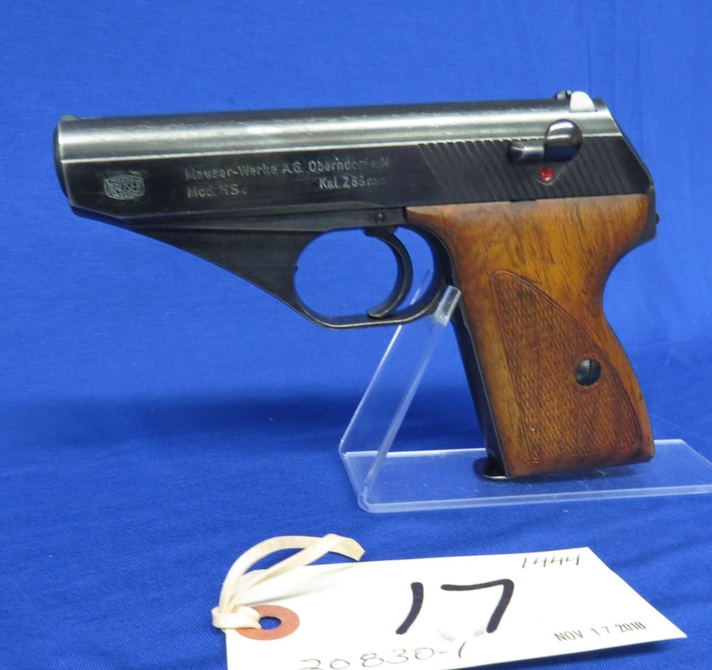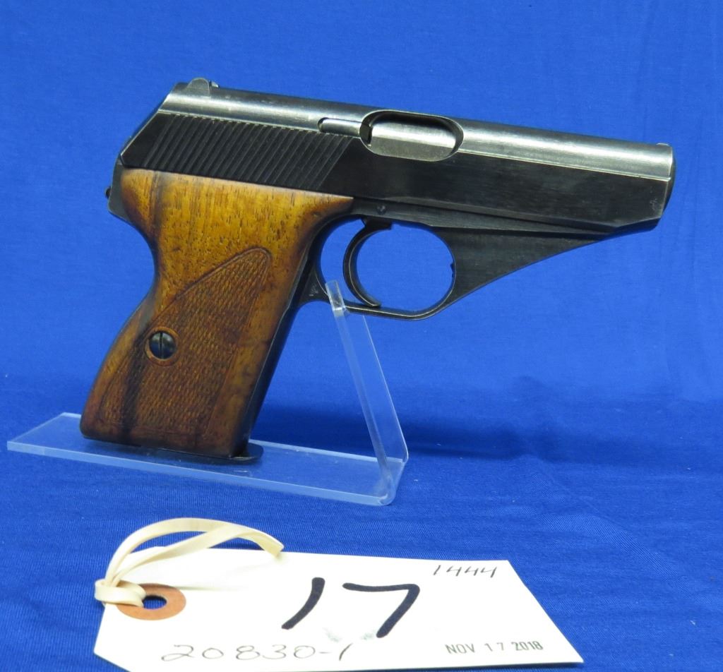 Prohibited, semi auto, 7.65mm, 86mm barrel, SN 795433. Wood grips very good, bluing good, bore has light pitting. Comes with brown leather holster.