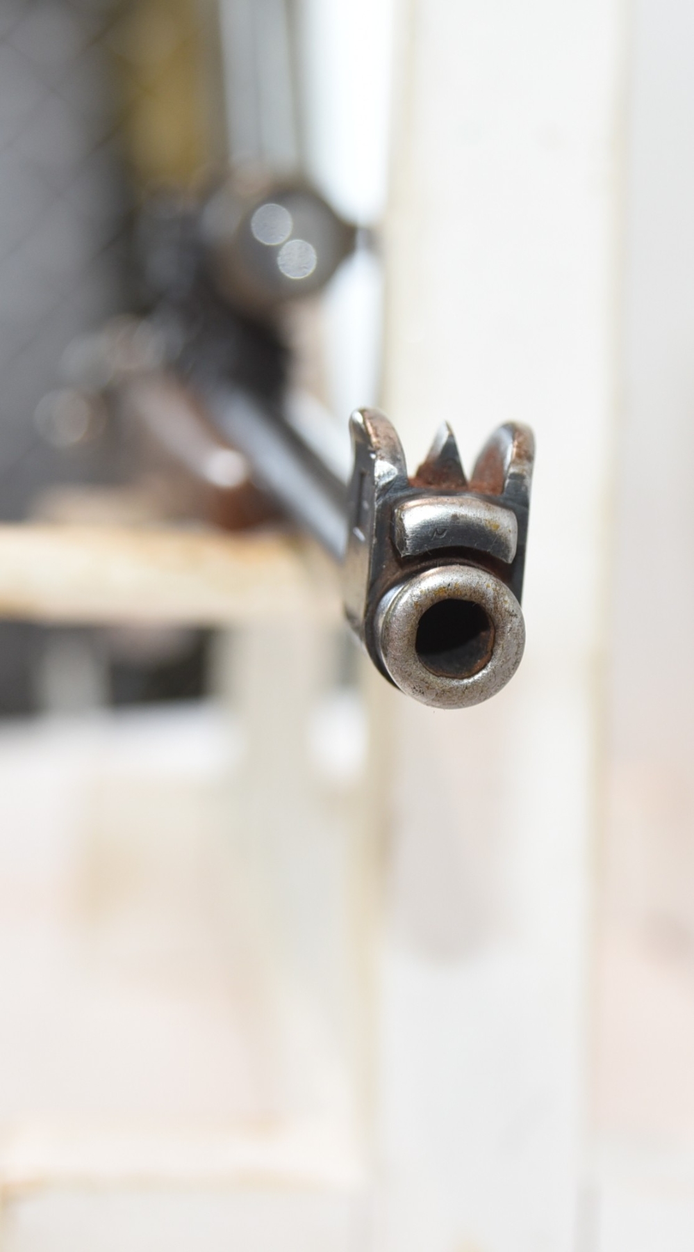 Bore is grey with light pitting throughout, rifling is present; condition is less than fair.
