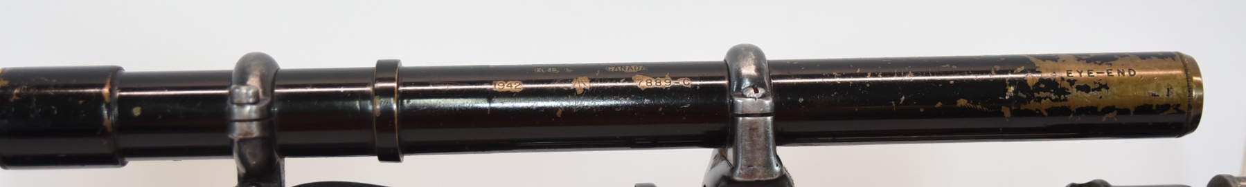 Metal shows rear sight is missing due to a scope mount, there is finish wear in various areas throughout, there are scratches, scuffs, light dents present as well. Scope shows finish wear exposing a brass look. Condition is good.