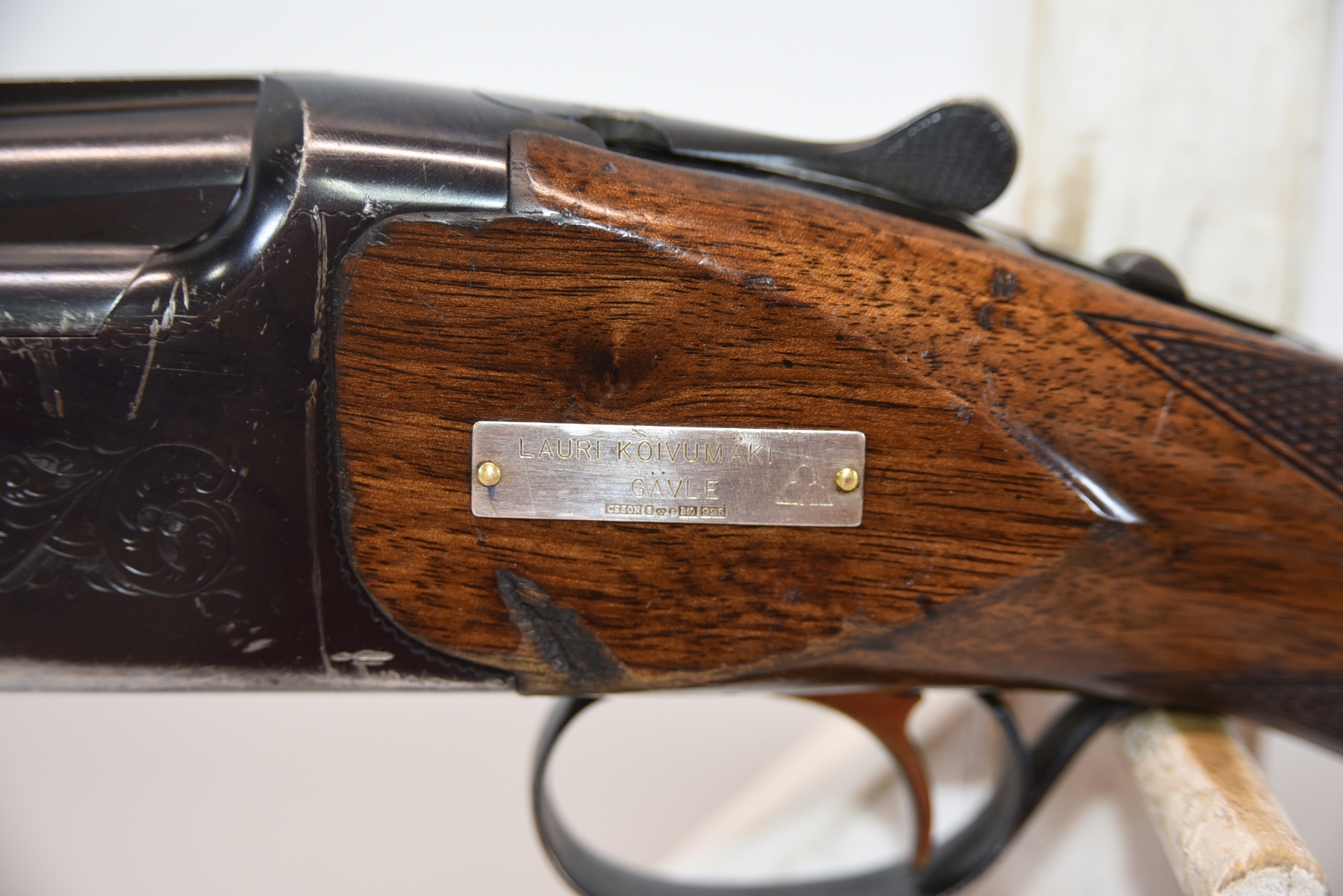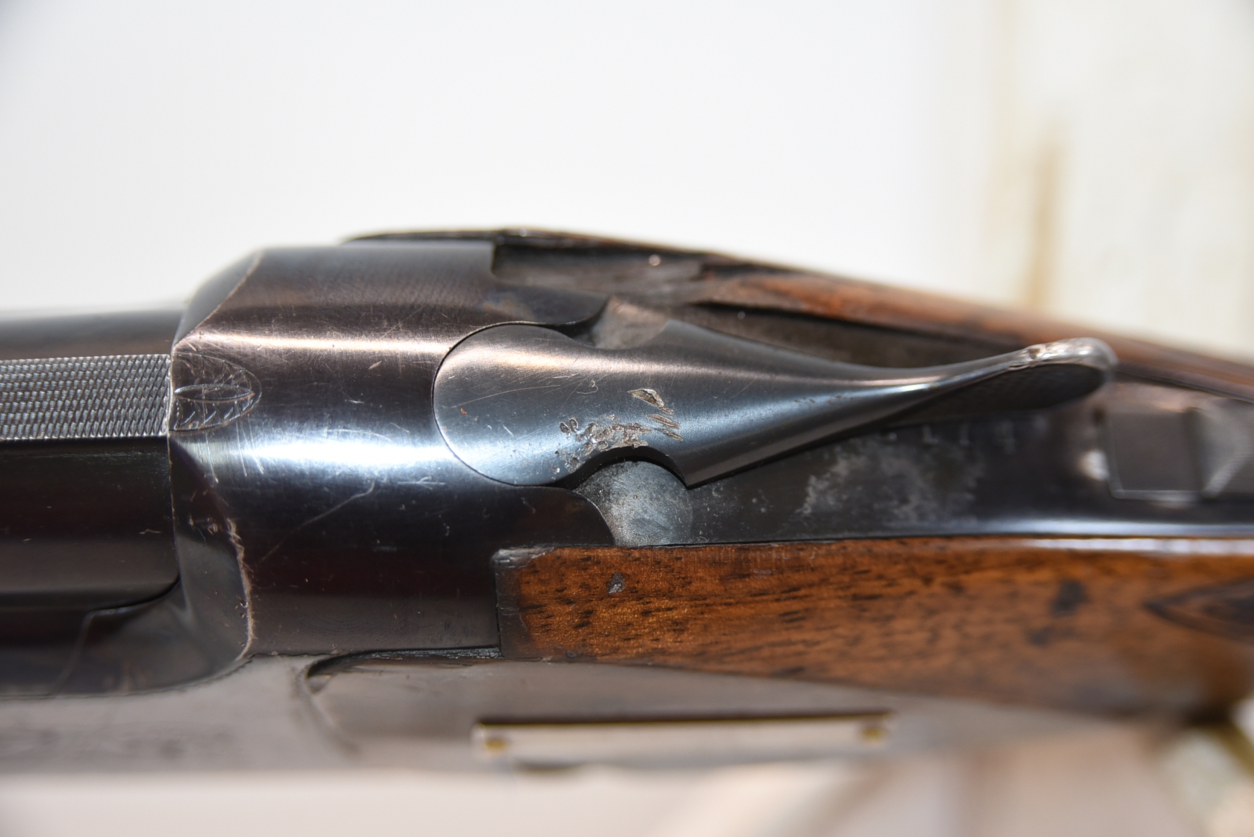 Metal shows blued finish wear on receiver and other areas, scratches, scuffs, few small dents on various parts; condition is fair.