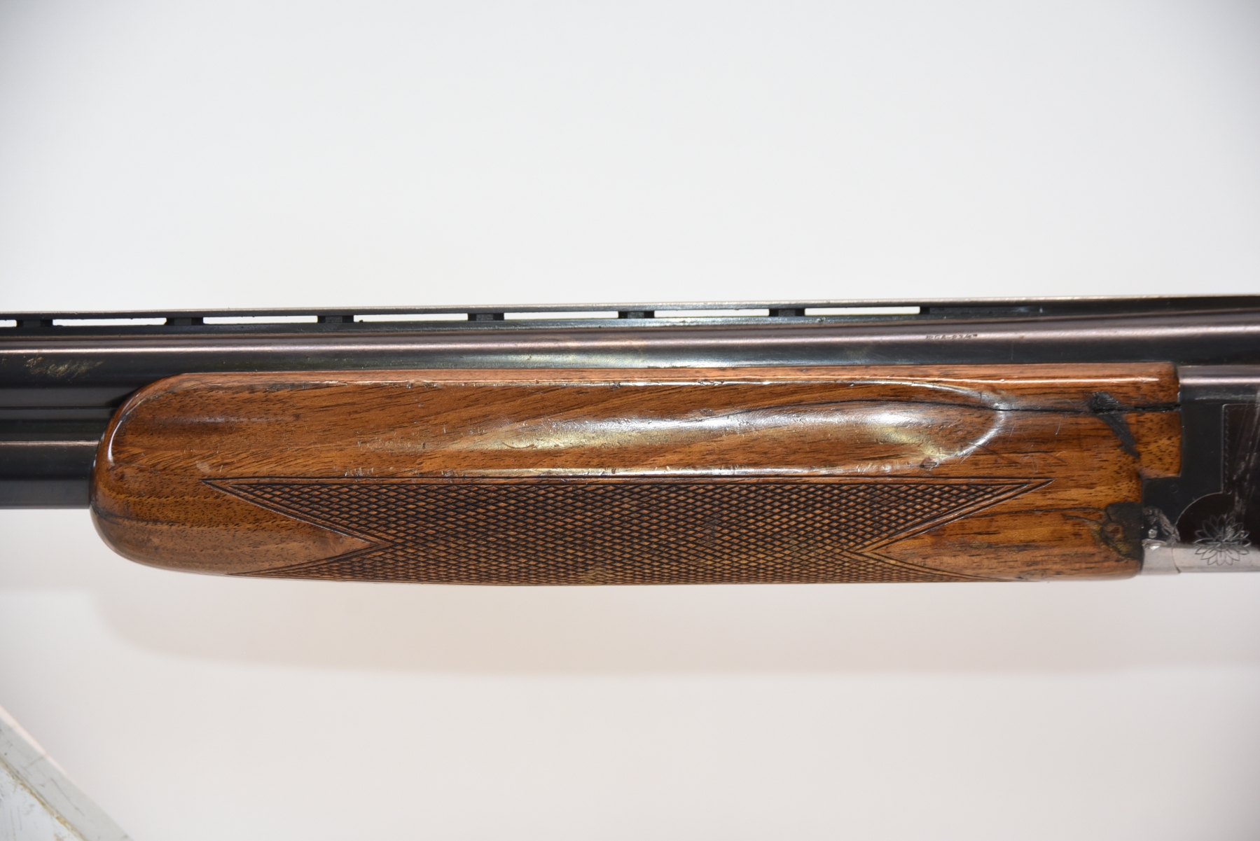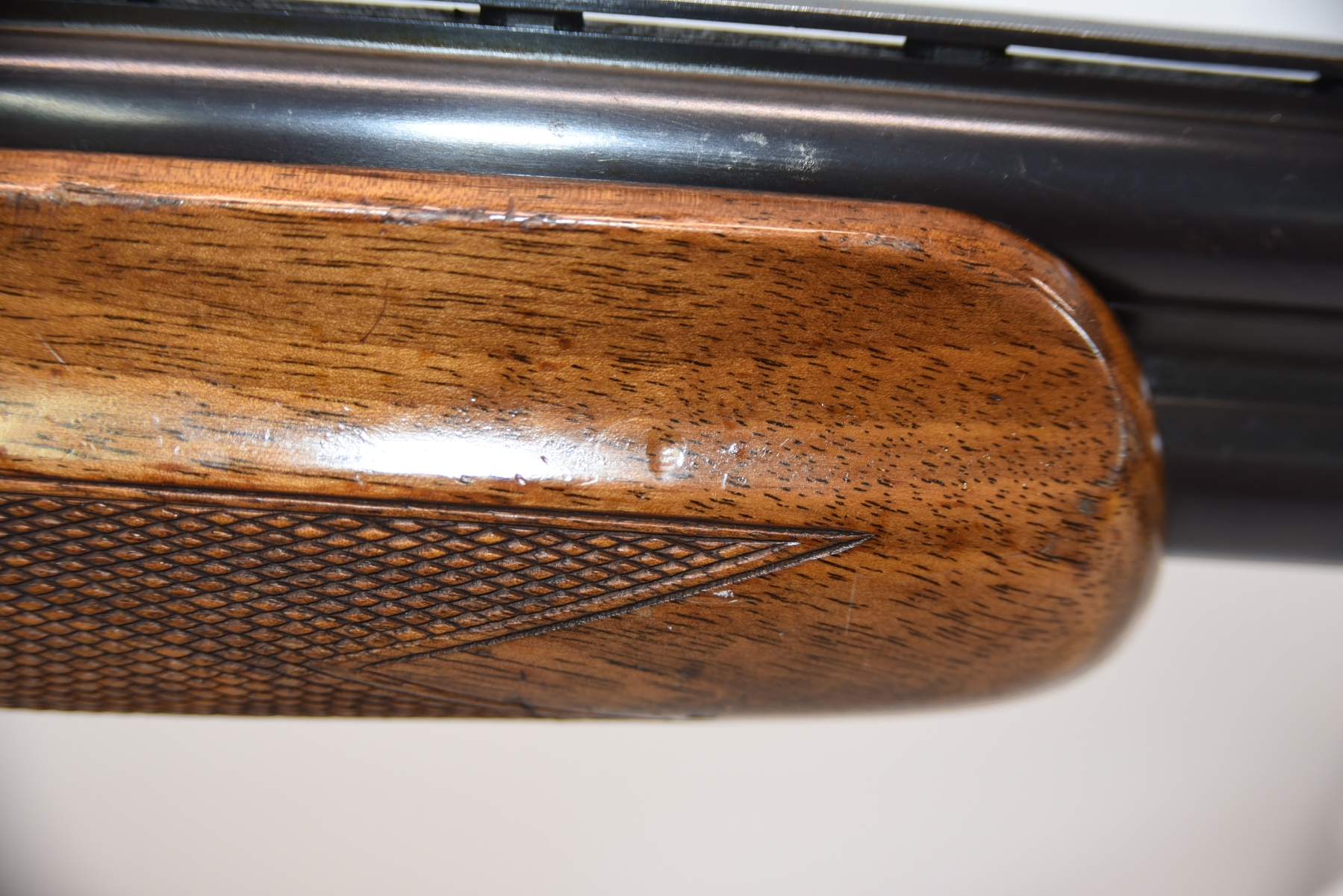 Wood stock shows a 4" long crack on left side of forearm, rear stock shows a crack in the upper tang, a large chip on the upper right side of rear stock, there are chips in both forearm and rear stock along with finish wear, scratches, scuffs, butt pad is not factory original; condition is less than fair.