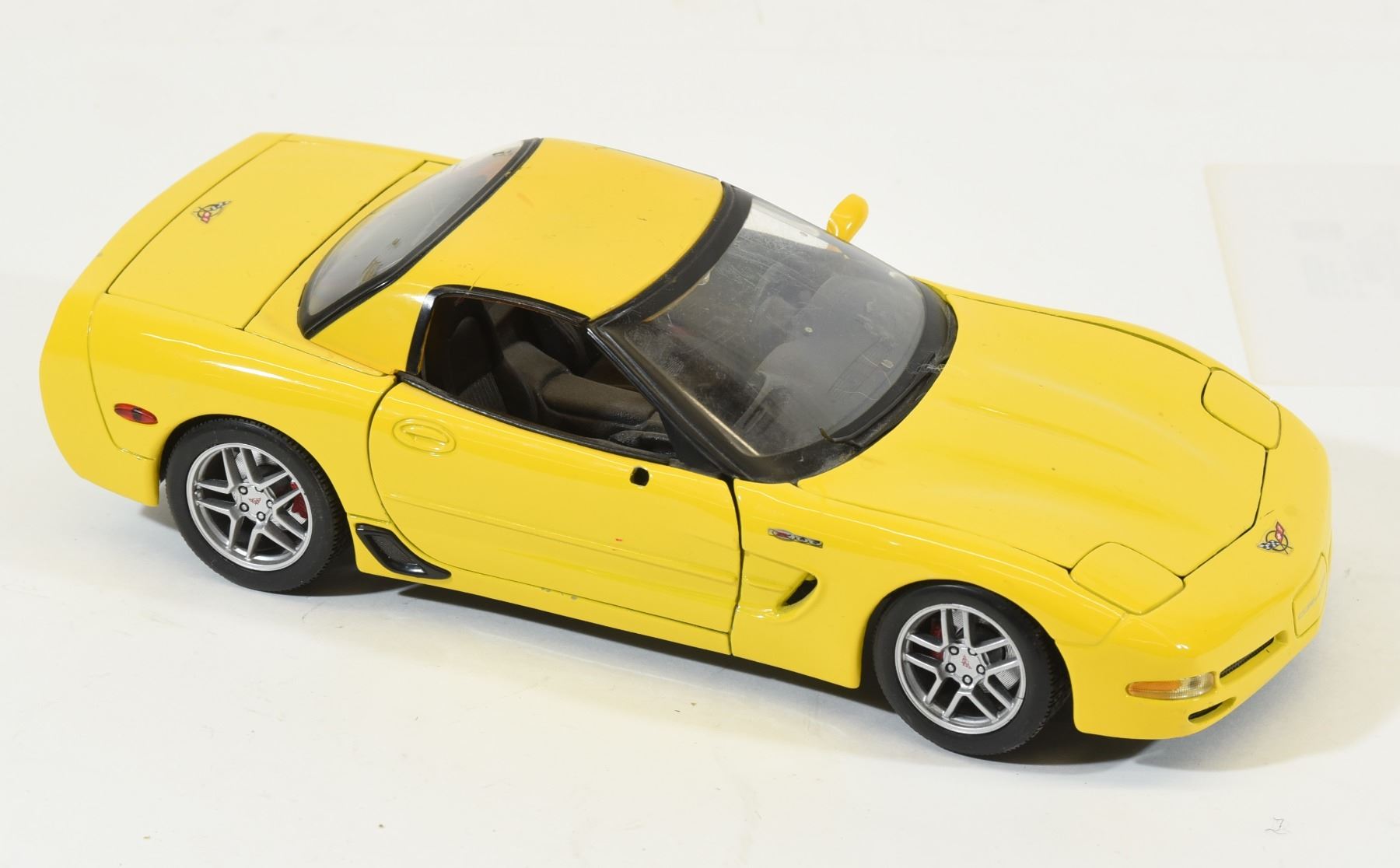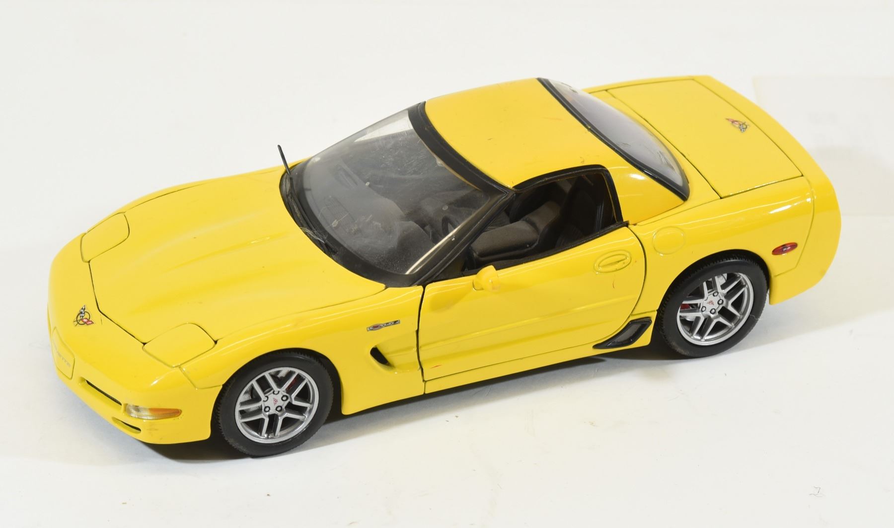 Red 1:24 scale BMW Z8 roadster missing windshield. Yellow 1:18 scale 2001 Corvette missing right side mirror. Ertl 1:64 scale General Lee.