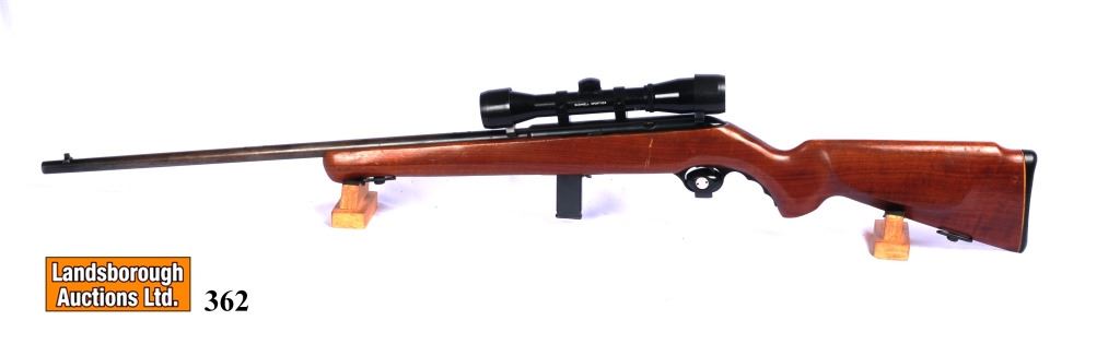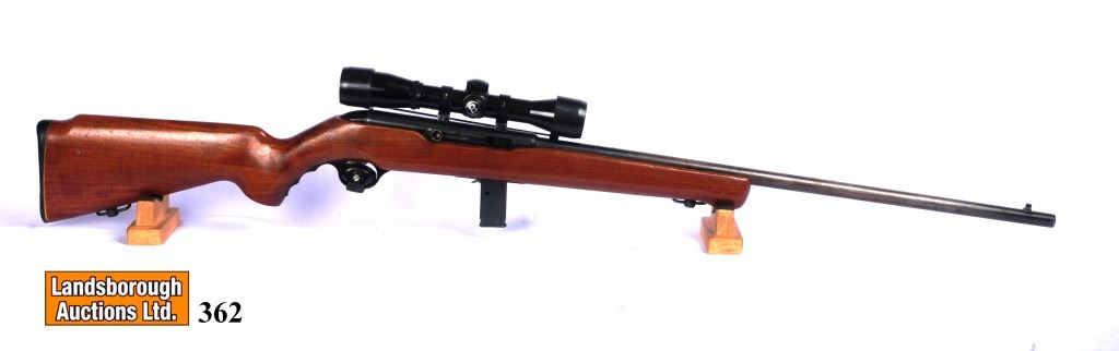 Non-restricted, semi auto, 22LR, 23" barrel, SN none. Wood has some scratches and marks, bluing brown on barrel, bore very good. Comes with Bushnell 4 x 32 scope.