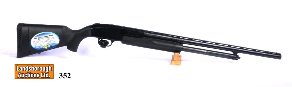 Non-Restricted, pump action, 20Ga x 3", 22" barrel with removable mod choke, SN LU962943. Synthetic stock and bluing have some marks, bore excellent.