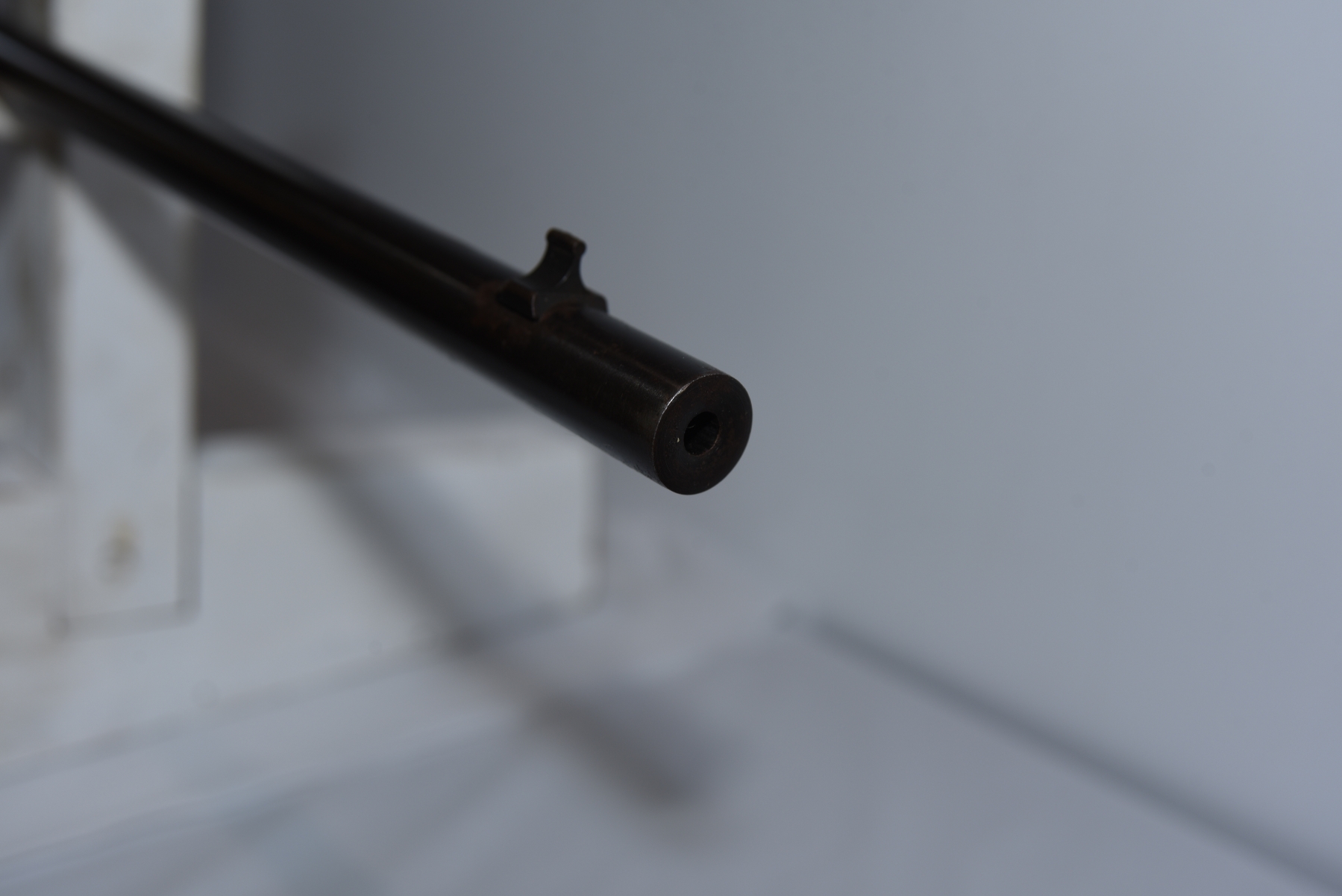 Metal finish shows scuffs and scratches, rear sight is missing, there are some patina spots, light rust areas; condition is very good.
