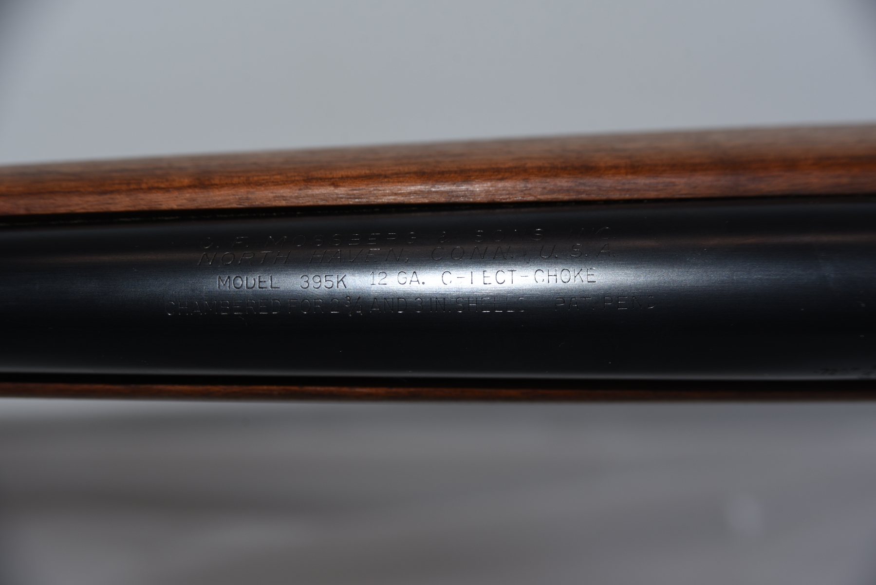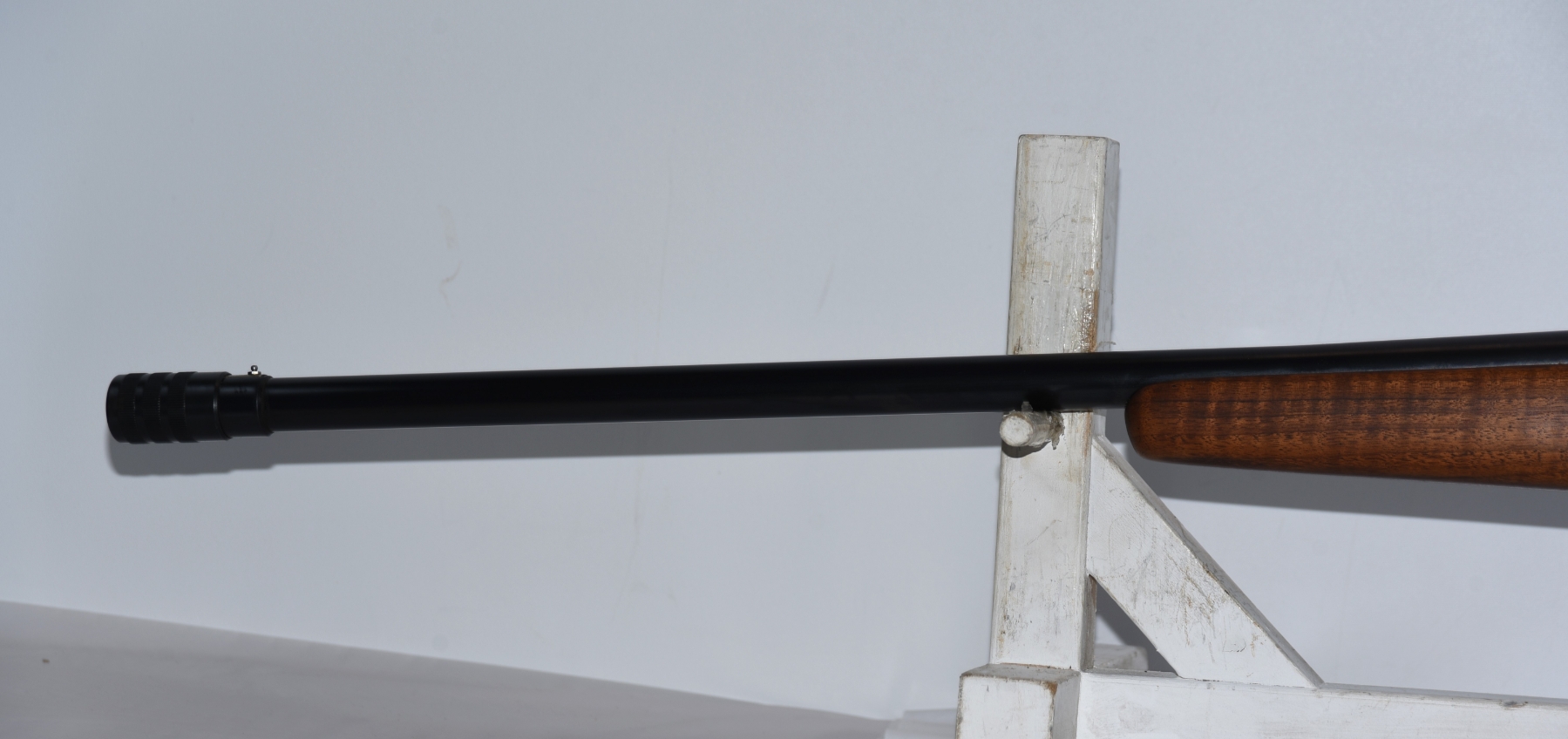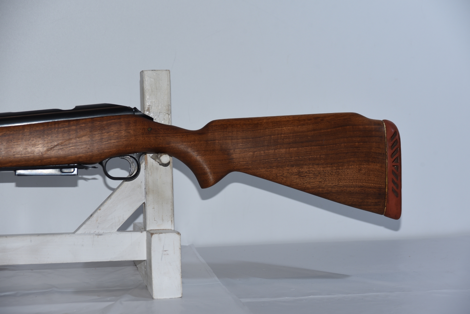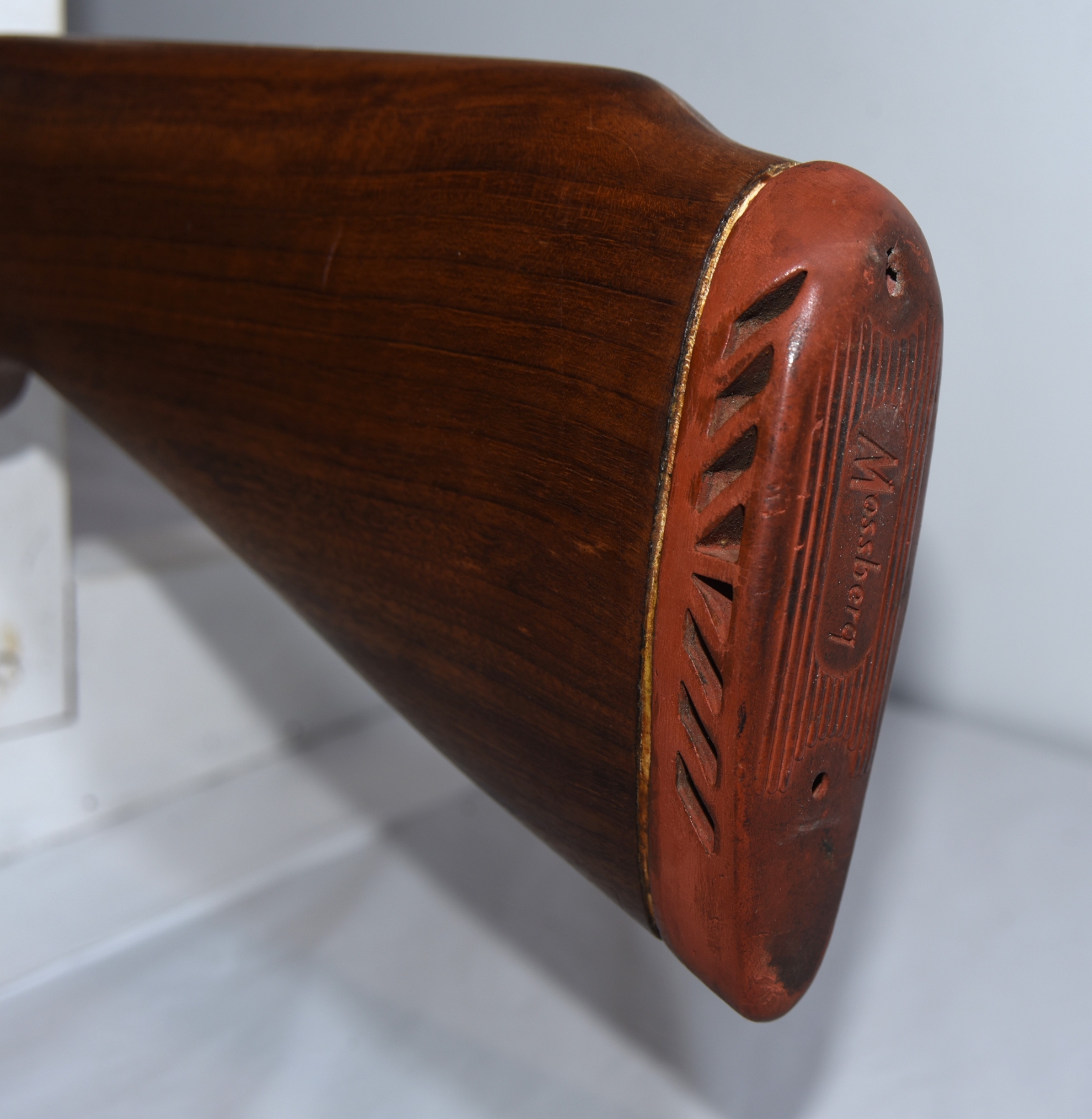 Wood stock shows scratches and scuffs, rubber recoil pad is worn; condition is good.