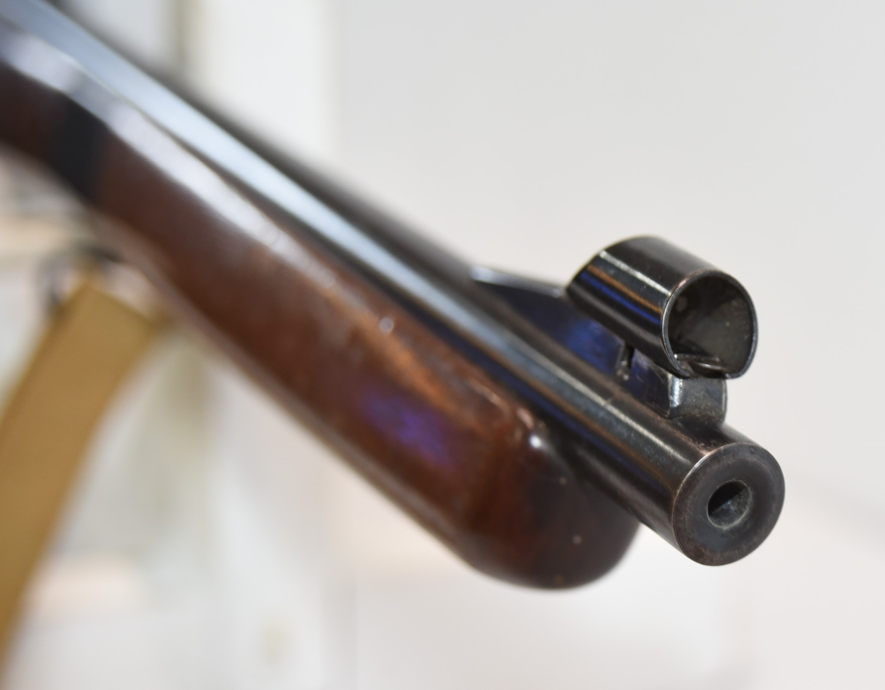 Metal bluing shows light rust spots, scratches, scuffs, light patina specks, mid sight screws are missing, and bolt cover and screws are missing; condition is very good.