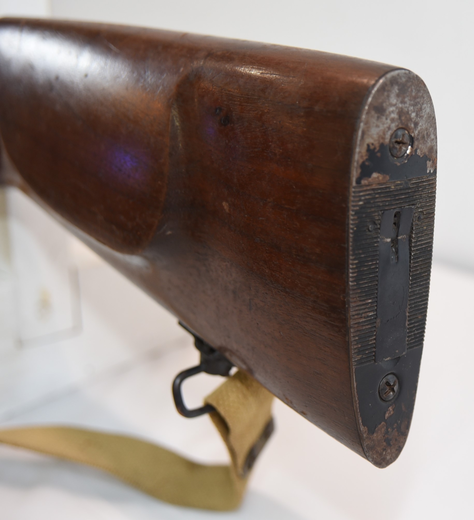 Wood stock shows light scratches, scuffs, dents, one of the safety indicator dots is missing; condition is very good.
