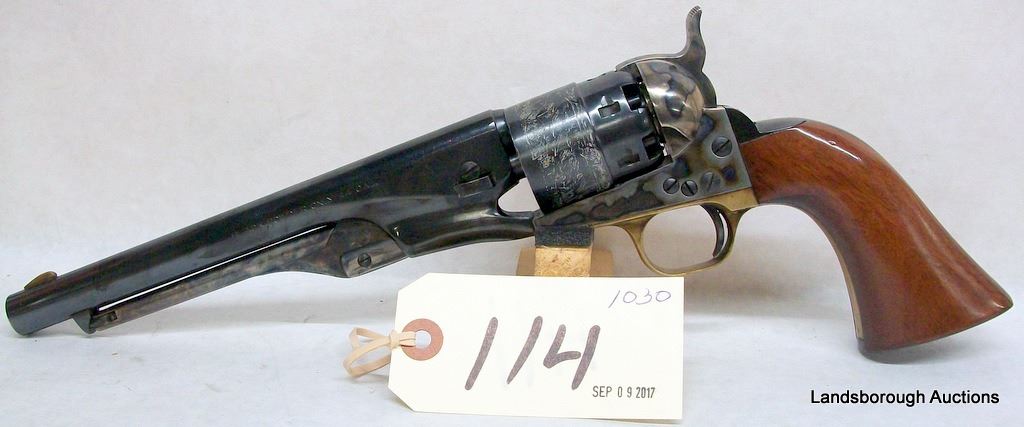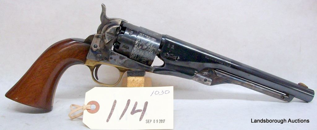 RESTRICTED, REVOLVER, 44 PERCUSSION, 203MM BARREL, SN 23856. WOOD GRIPS AND BLUE HAVE SOME MARKS, BORE VERY GOOD.