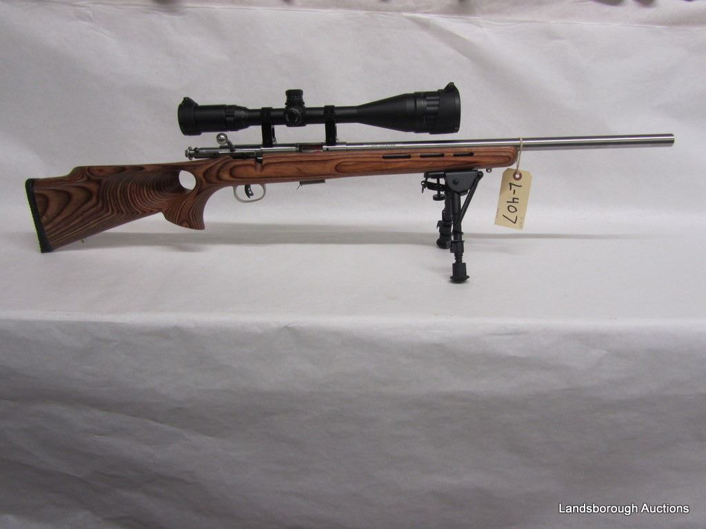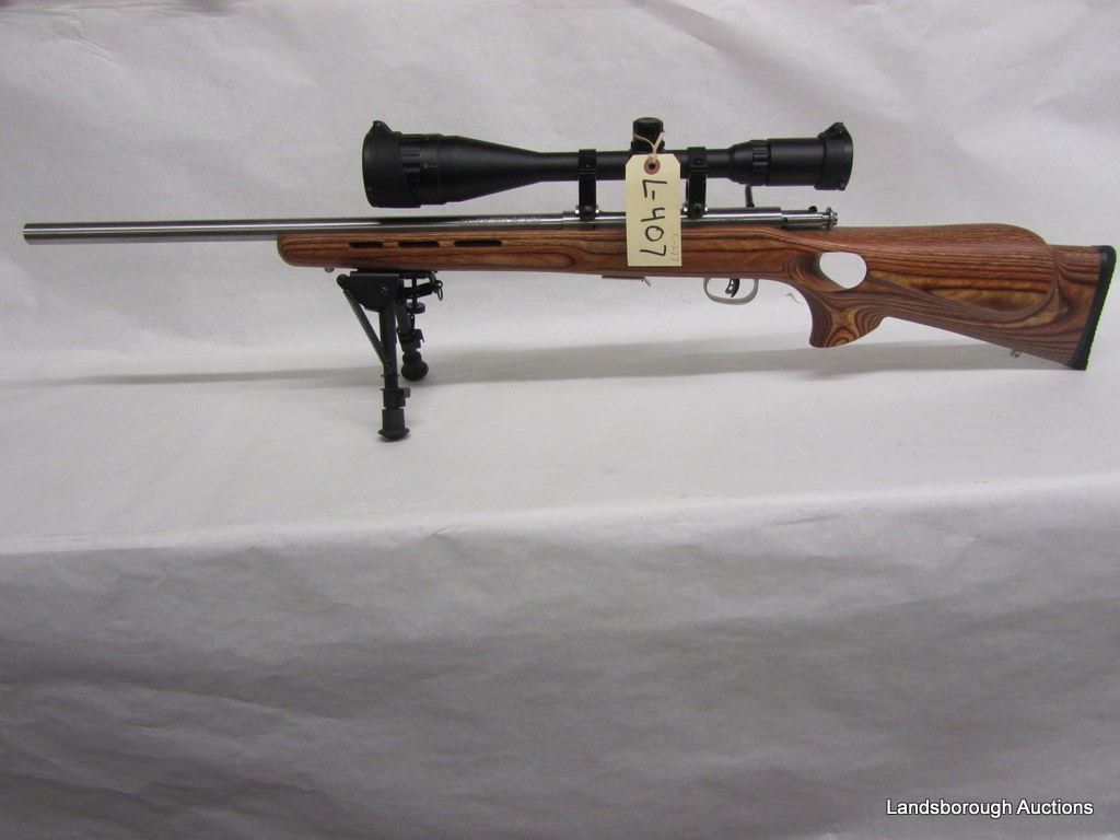 SERIAL #218897. STAINLESS HEAVY BARREL IN 17HMR, BOLT ACTION WITH 6X24X50 SCOPE BY SNIPER, LAMINATED THUMBHOLE STOCK WITH BIPOD.