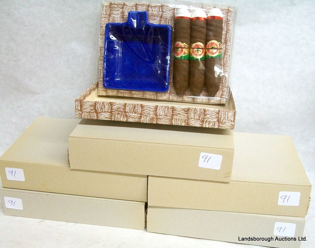 SIX GERMAN MADE HANDERCHIFS FASHINED LIKE CIGARS, COMES WITH ASHTRAY.