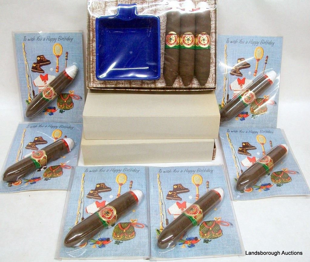GERMAN MADE HANDERCHIEFS FASHIONED TO LOOK LIKE CIGARS. THREE PACKAGES OF CIGARS AND ASHTRAY AND SIX HAPPY BIRTHDAY CIGARS.