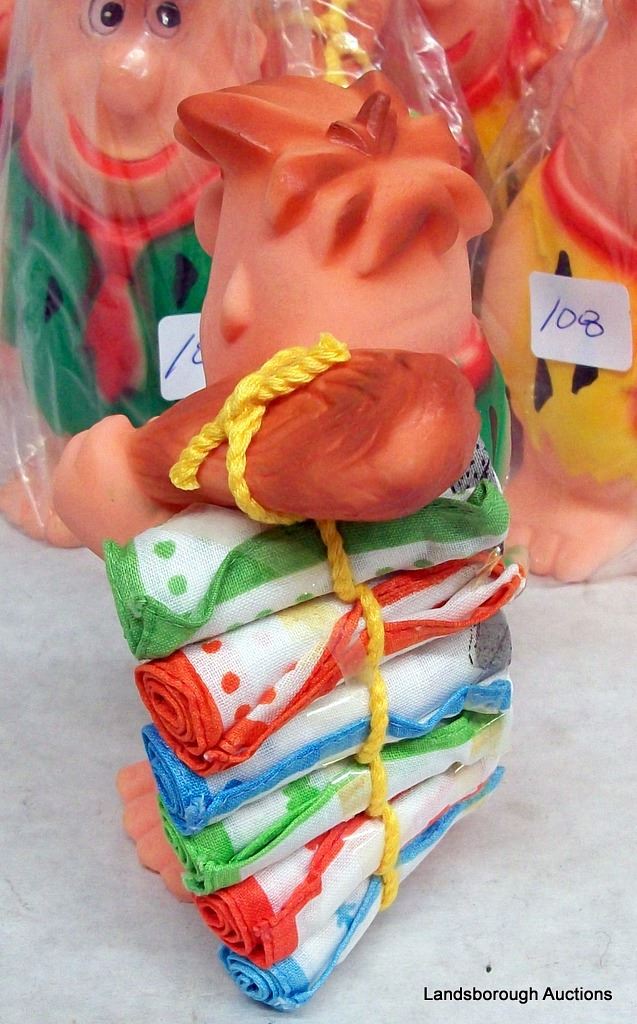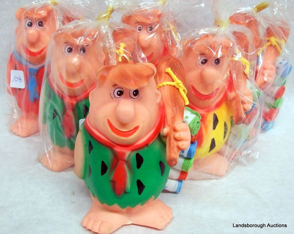 NEW RUBBER SQUEEZE TOY OF FRED FLINSTONE CARRYING SIX HANDKERCHIEFS. SIX PIECES.