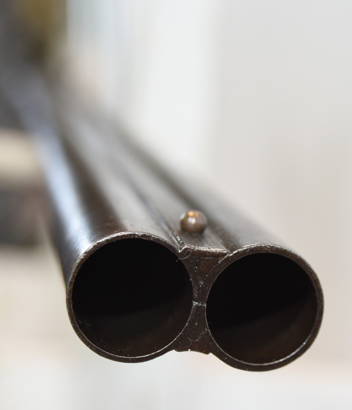 Metal finish shows patina, dent on the right barrel, worn finish, some light scratches, scuffs, light rust spots in areas; condition is good for age.