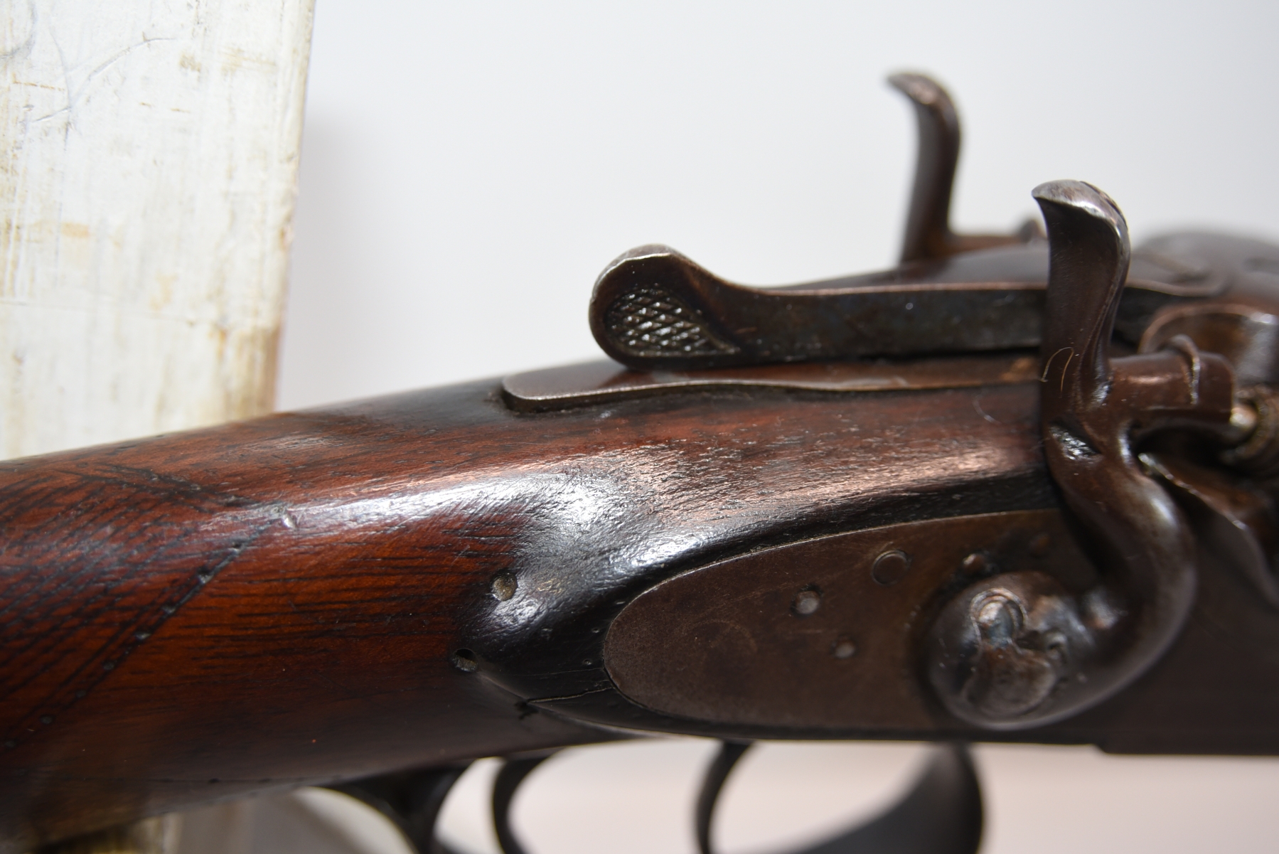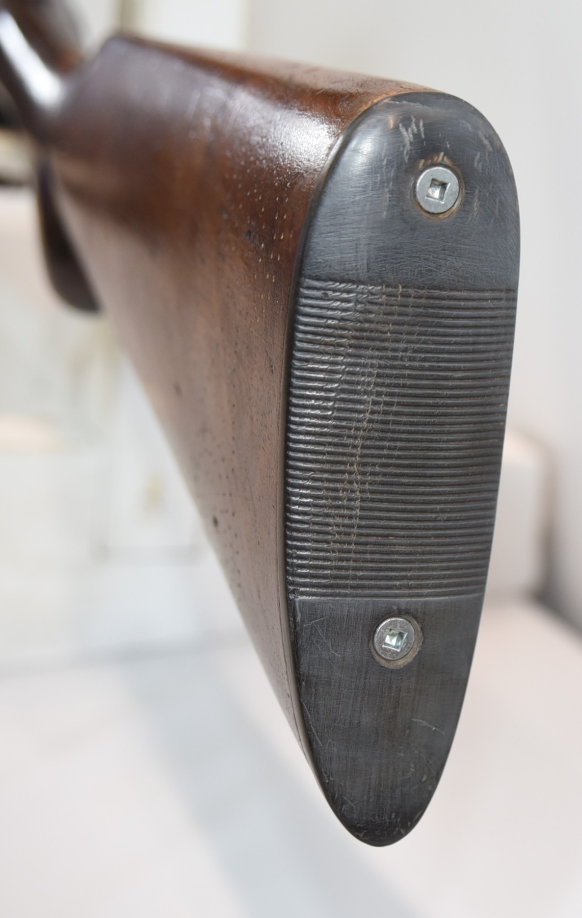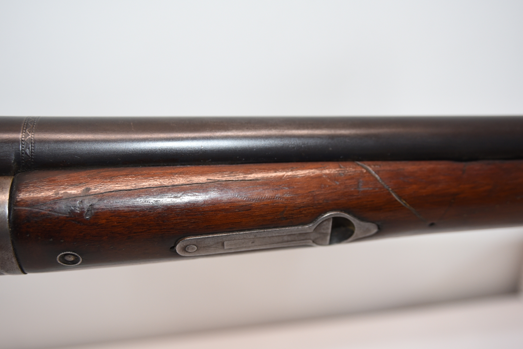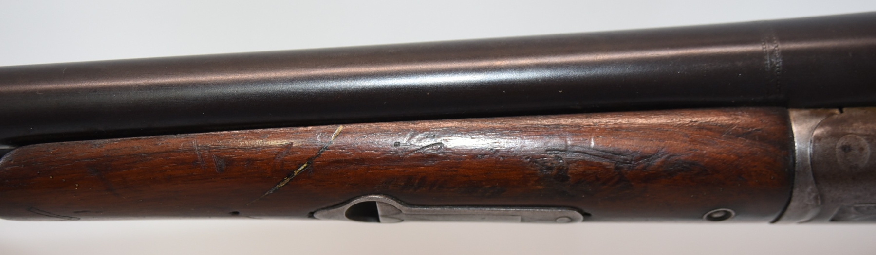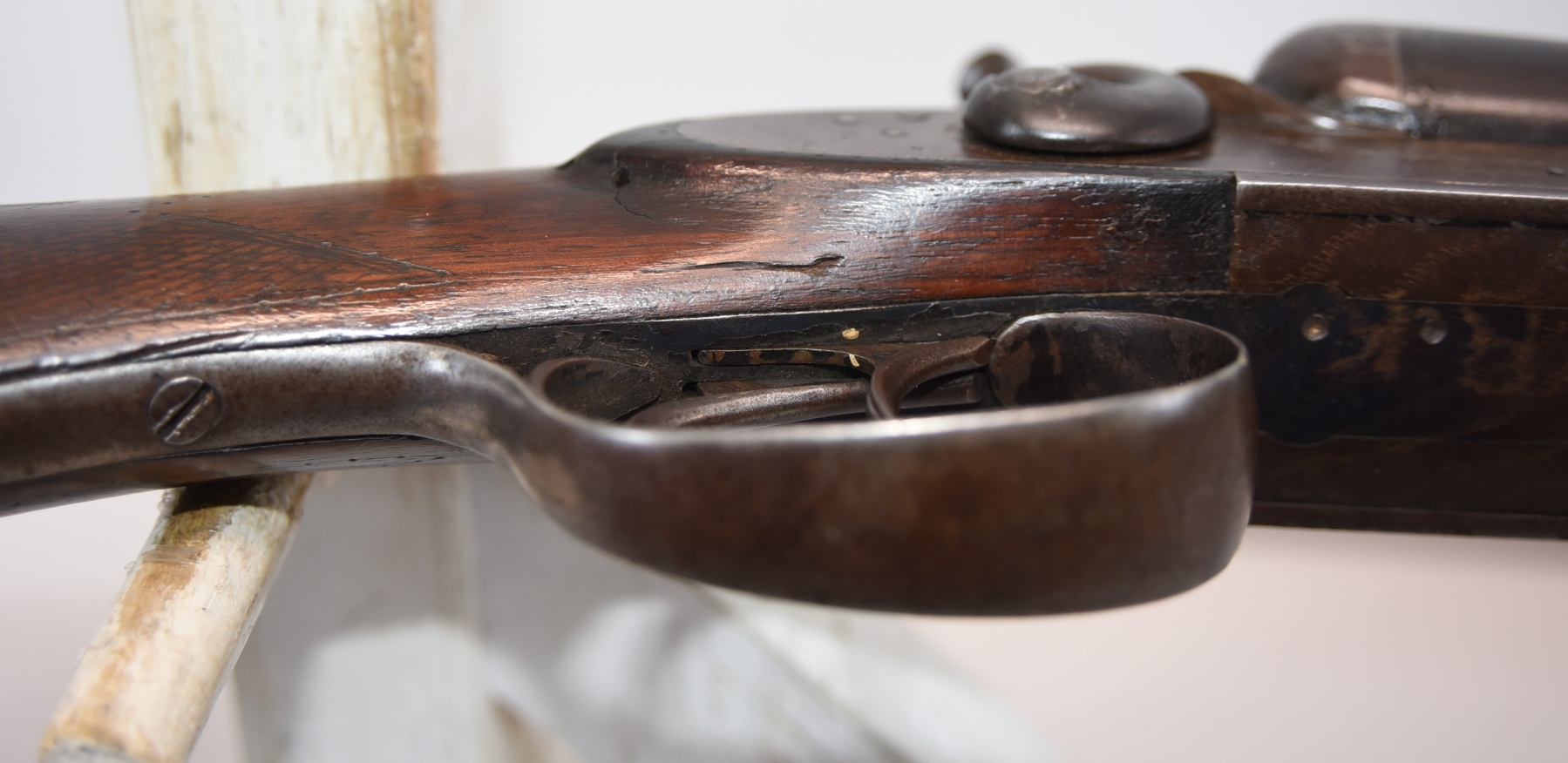 Wood stock shows finish wear, cracks behind the lock plates and small fine cracks in other areas of rear stock, there are scratches, dents, scuffs; condition is good for age.